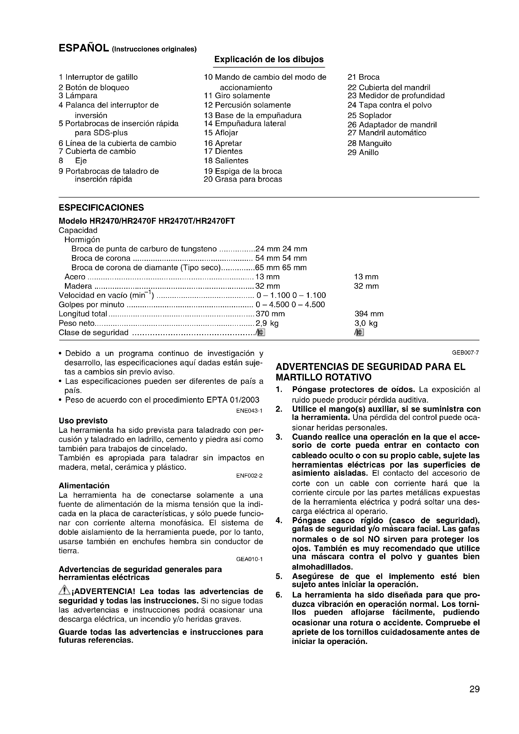 - Alleen voor Europese landen De EG-verklaring van conformiteit is bijgesloten als Aan- hangsel A bij deze gebruiksaanwijzing.29 ESPAÑOL (Instrucciones originales) Explicación de los dibujos 1 Interruptor de gatillo 2 Botón de bloqueo 3 Lámpara 4 Palanca del interruptor de inversión 5 Portabrocas de inserción rápida para SDS-plus 6 Línea de la cubierta de cambio 7 Cubierta de cambio 8Eje 9 Portabrocas de taladro de inserción rápida 10 Mando de cambio del modo de accionamiento 11 Giro solamente 12 Percusión solamente 13 Base de la empuñadura 14 Empuñadura lateral 15 Aflojar 16 Apretar 17 Dientes 18 Salientes 19 Espiga de la broca 20 Grasa para brocas 21 Broca 22 Cubierta del mandril 23 Medidor de profundidad 24 Tapa contra el polvo 25 Soplador 26 Adaptador de mandril 27 Mandril automático 28 Manguito 29 Anillo ESPECIFICACIONES Modelo HR2470/HR2470F HR2470T/HR2470FT Capacidad Hormigón Broca de punta de carburo de tungsteno p. 24