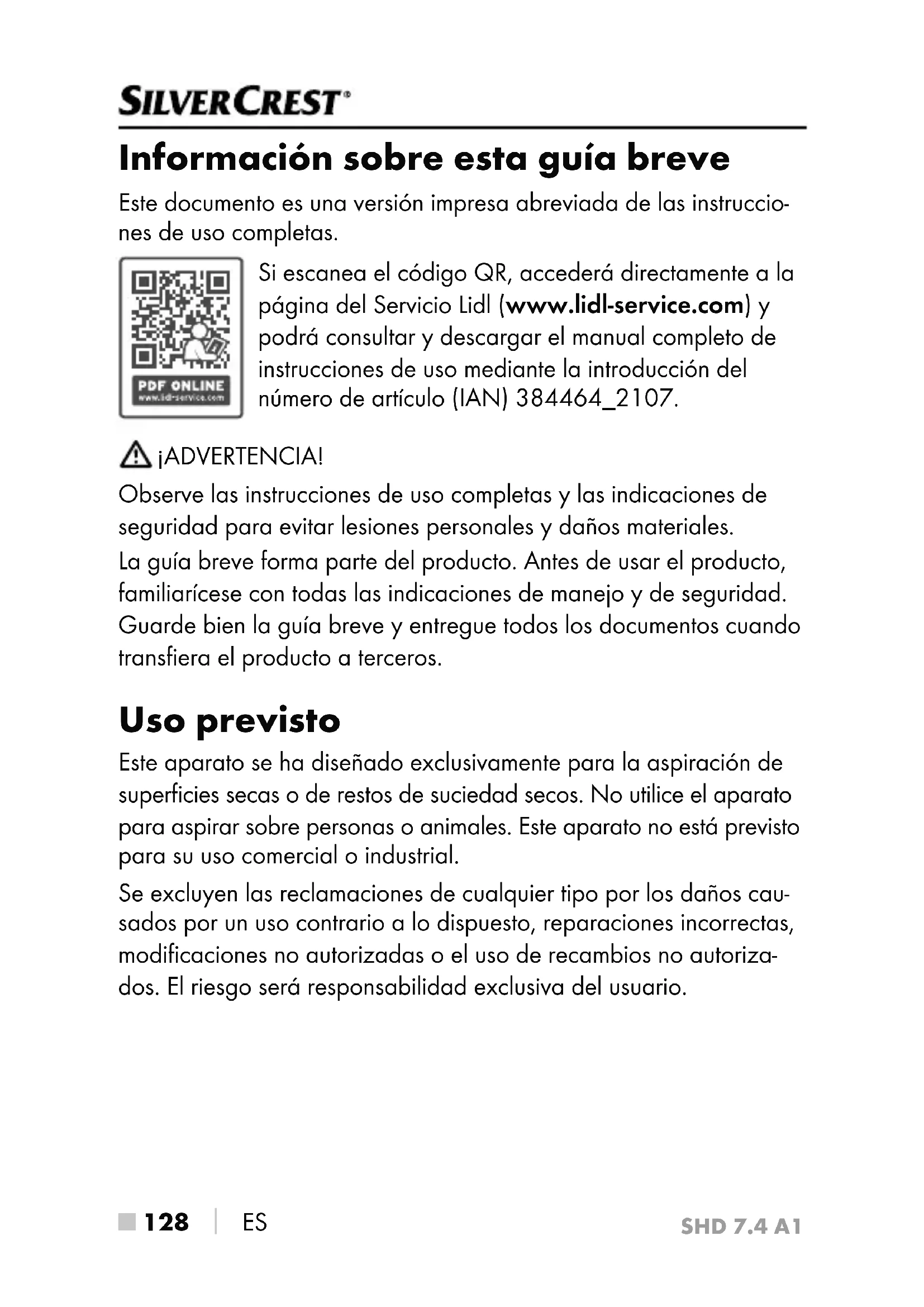 ES Información sobre esta guía breve Este documento es una versión impresa abreviada de las instruccio- nes de uso completas. Si escanea el código QR, accederá directamente a la página del Servicio Lidl (www.lidl-service.com) y podrá consultar y descargar el manual completo de instrucciones de uso mediante la introducción del número de artículo (IAN) 384464_2107. ¡ADVERTENCIA! Observe las instrucciones de uso completas y las indicaciones de seguridad para evitar lesiones personales y daños materiales. La guía breve forma parte del producto. Antes de usar el producto, familiarícese con todas las indicaciones de manejo y de seguridad. Guarde bien la guía breve y entregue todos los documentos cuando transfiera el producto a terceros. Uso previsto Este aparato se ha diseñado exclusivamente para la aspiración de superficies secas o de restos de suciedad secos. No utilice el aparato para aspirar sobre personas o animales. Este aparato no está previsto para su uso comercial o industrial. Se excluyen las reclamaciones de cualquier tipo por los daños cau- sados por un uso contrario a lo dispuesto, reparaciones incorrectas, modificaciones no autorizadas o el uso de recambios no autoriza- dos. El riesgo será responsabilidad exclusiva del usuario.SHD 7.4 A1 ES