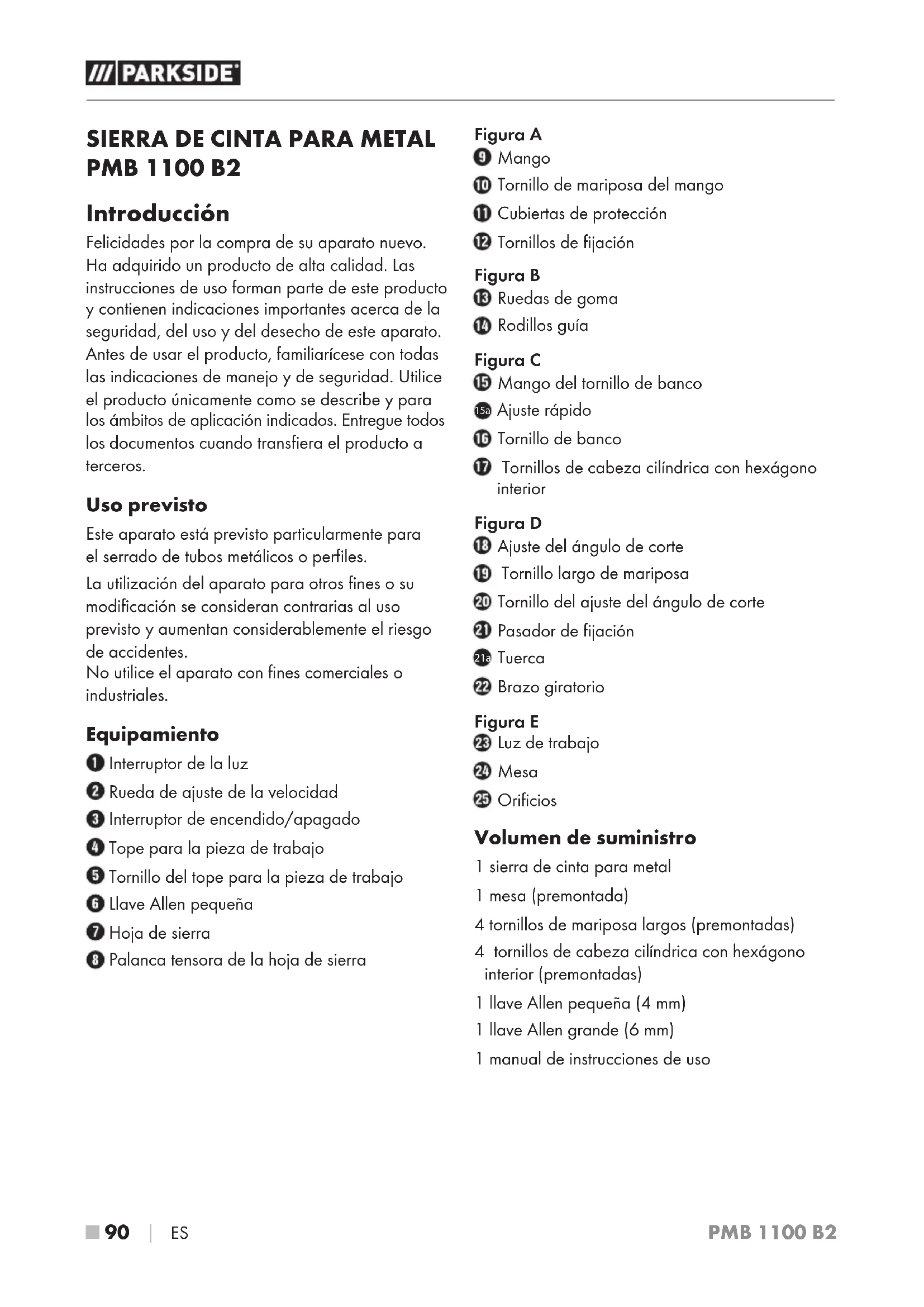 PMB 1100 B2 Introducción Felicidades por la compra de su aparato nuevo. Ha adquirido un producto de alta calidad. Las instrucciones de uso forman parte de este producto y contienen indicaciones importantes acerca de la seguridad, del uso y del desecho de este aparato. Antes de usar el producto, familiarícese con todas las indicaciones de manejo y de seguridad. Utilice el producto únicamente como se describe y para los ámbitos de aplicación indicados. Entregue todos los documentos cuando transfiera el producto a terceros. Uso previsto Este aparato está previsto particularmente para el serrado de tubos metálicos o perfiles. La utilización del aparato para otros fines o su modificación se consideran contrarias al uso previsto y aumentan considerablemente el riesgo de accidentes. No utilice el aparato con fines comerciales o industriales. Equipamiento Interruptor de la luz Rueda de ajuste de la velocidad Interruptor de encendido/apagado Tope para la pieza de trabajo Tornillo del tope para la pieza de trabajo Llave Allen pequeña Hoja de sierra Palanca tensora de la hoja de sierra Figura A Mango Tornillo de mariposa del mango Cubiertas de protección Tornillos de fijación Figura B Ruedas de goma Rodillos guía Figura C Mango del tornillo de banco 15a Ajuste rápido Tornillo de banco Tornillos de cabeza cilíndrica con hexágono interior Figura D Ajuste del ángulo de corte Tornillo largo de mariposa Tornillo del ajuste del ángulo de corte Pasador de fijación 21a Tuerca Brazo giratorio Figura E Luz de trabajo Mesa Orificios Volumen de suministro 1 sierra de cinta para metal 1 mesa (premontada) 4 tornillos de mariposa largos (premontadas) 4 tornillos de cabeza cilíndrica con hexágono interior (premontadas) 1 llave Allen pequeña (4 mm) 1 llave Allen grande (6 mm) 1manual de instrucciones de usoPMB 1100 B2 ES