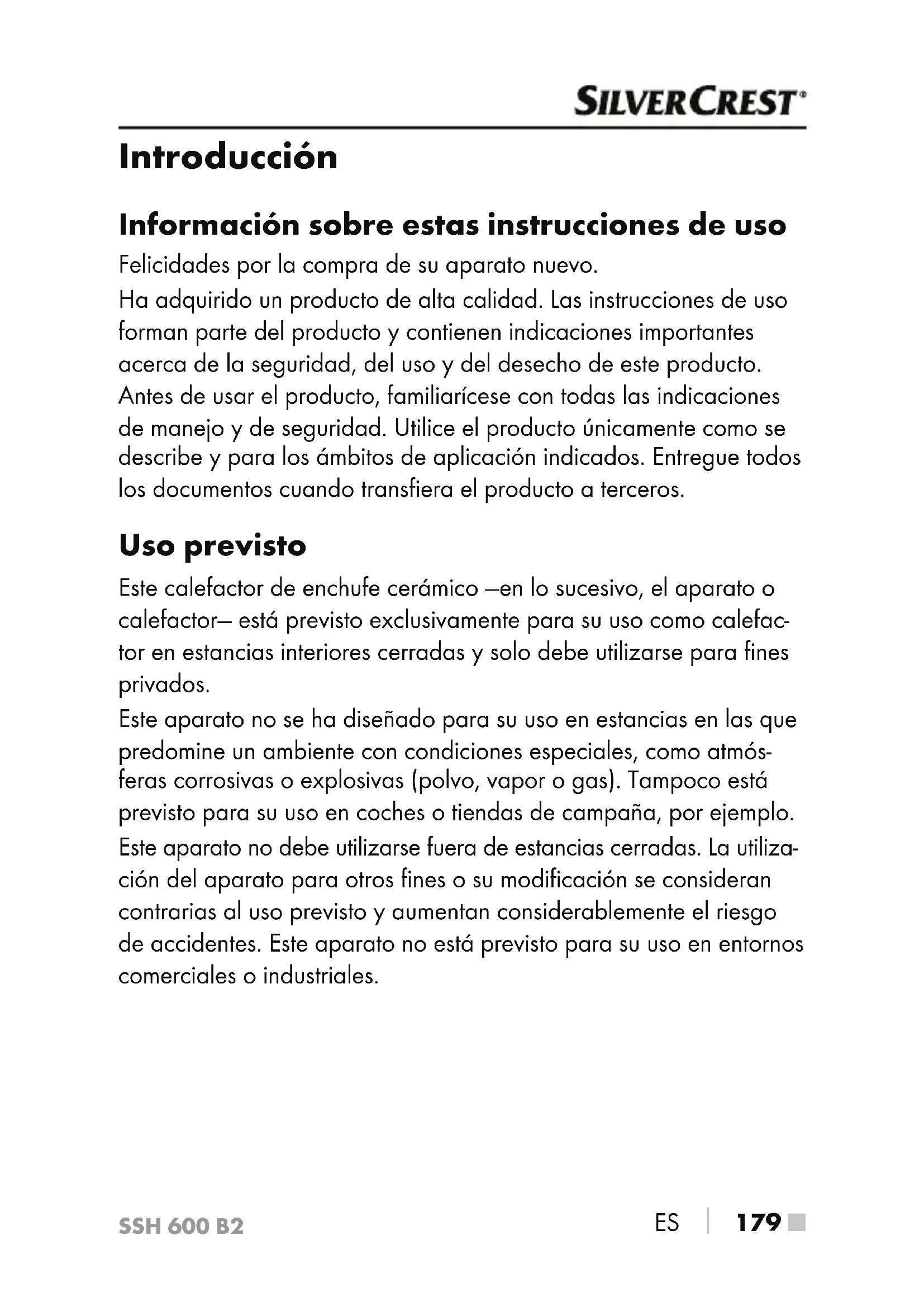 179 ■ Introducción Información sobre estas instrucciones de uso Felicidades por la compra de su aparato nuevo. Ha adquirido un producto de alta calidad. Las instrucciones de uso forman parte del producto y contienen indicaciones importantes acerca de la seguridad, del uso y del desecho de este producto. Antes de usar el producto, familiarícese con todas las indicaciones de manejo y de seguridad. Utilice el producto únicamente como se describe y para los ámbitos de aplicación indicados. Entregue todos los documentos cuando transfiera el producto a terceros. Uso previsto Este calefactor de enchufe cerámico —en lo sucesivo, el aparato o calefactor— está previsto exclusivamente para su uso como calefac- tor en estancias interiores cerradas y solo debe utilizarse para fines privados. Este aparato no se ha diseñado para su uso en estancias en las que predomine un ambiente con condiciones especiales, como atmós- feras corrosivas o explosivas (polvo, vapor o gas). Tampoco está previsto para su uso en coches o tiendas de campaña, por ejemplo. Este aparato no debe utilizarse fuera de estancias cerradas. La utiliza- ción del aparato para otros fines o su modificación se consideran contrarias al uso previsto y aumentan considerablemente el riesgo de accidentes. Este aparato no está previsto para su uso en entornos comerciales o industriales.SSH 600 B2 ■ 180