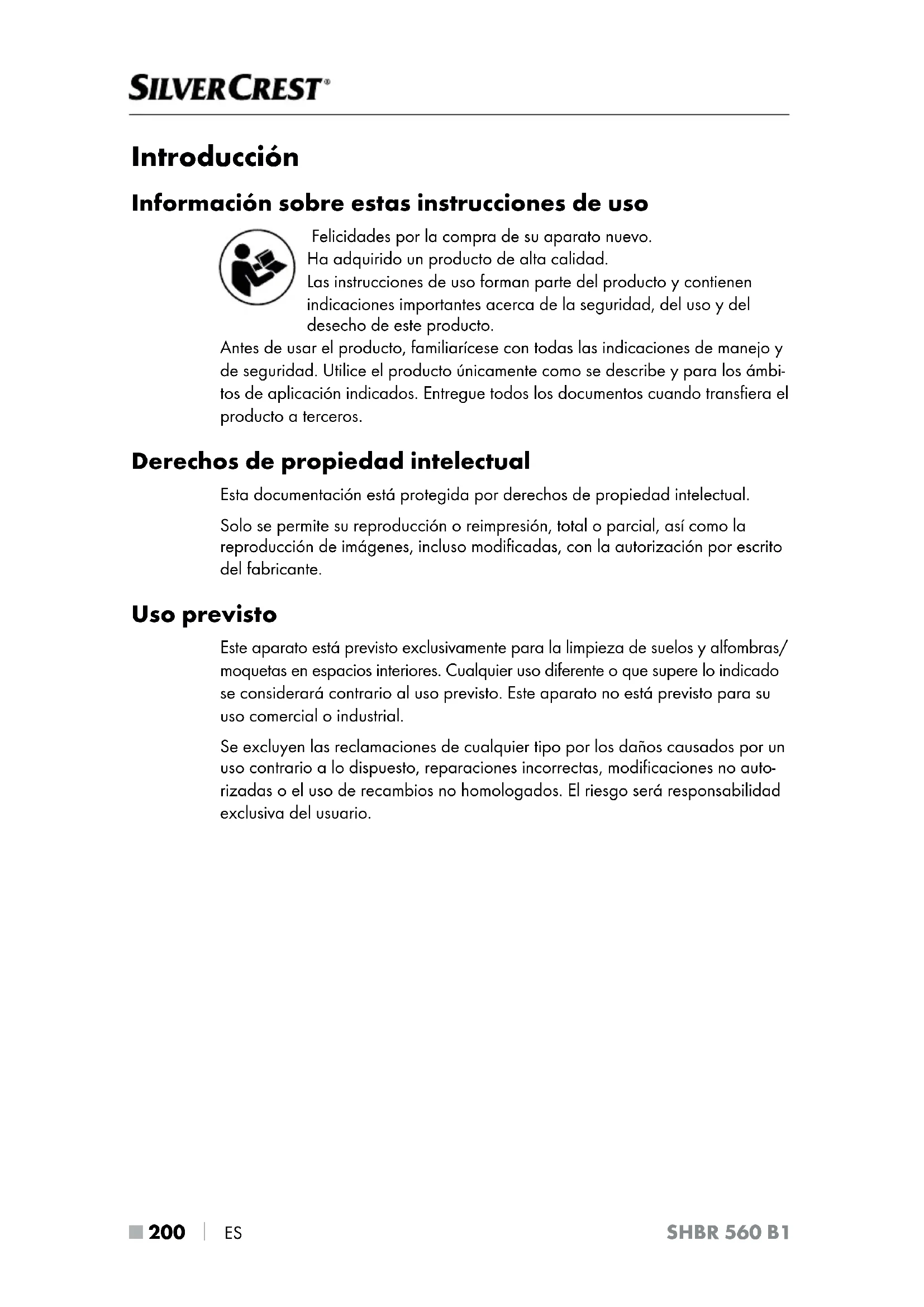 ES SHBR 560 B1 Introducción Información sobre estas instrucciones de uso Felicidades por la compra de su aparato nuevo. Ha adquirido un producto de alta calidad. Las instrucciones de uso forman parte del producto y contienen indicaciones importantes acerca de la seguridad, del uso y del desecho de este producto. Antes de usar el producto, familiarícese con todas las indicaciones de manejo y de seguridad. Utilice el producto únicamente como se describe y para los ámbi- tos de aplicación indicados. Entregue todos los documentos cuando transfiera el producto a terceros. Derechos de propiedad intelectual Esta documentación está protegida por derechos de propiedad intelectual. Solo se permite su reproducción o reimpresión, total o parcial, así como la reproducción de imágenes, incluso modificadas, con la autorización por escrito del fabricante. Uso previsto Este aparato está previsto exclusivamente para la limpieza de suelos y alfombras/ moquetas en espacios interiores. Cualquier uso diferente o que supere lo indicado se considerará contrario al uso previsto. Este aparato no está previsto para su uso comercial o industrial. Se excluyen las reclamaciones de cualquier tipo por los daños causados por un uso contrario a lo dispuesto, reparaciones incorrectas, modificaciones no auto- rizadas o el uso de recambios no homologados. El riesgo será responsabilidad exclusiva del usuario.ES