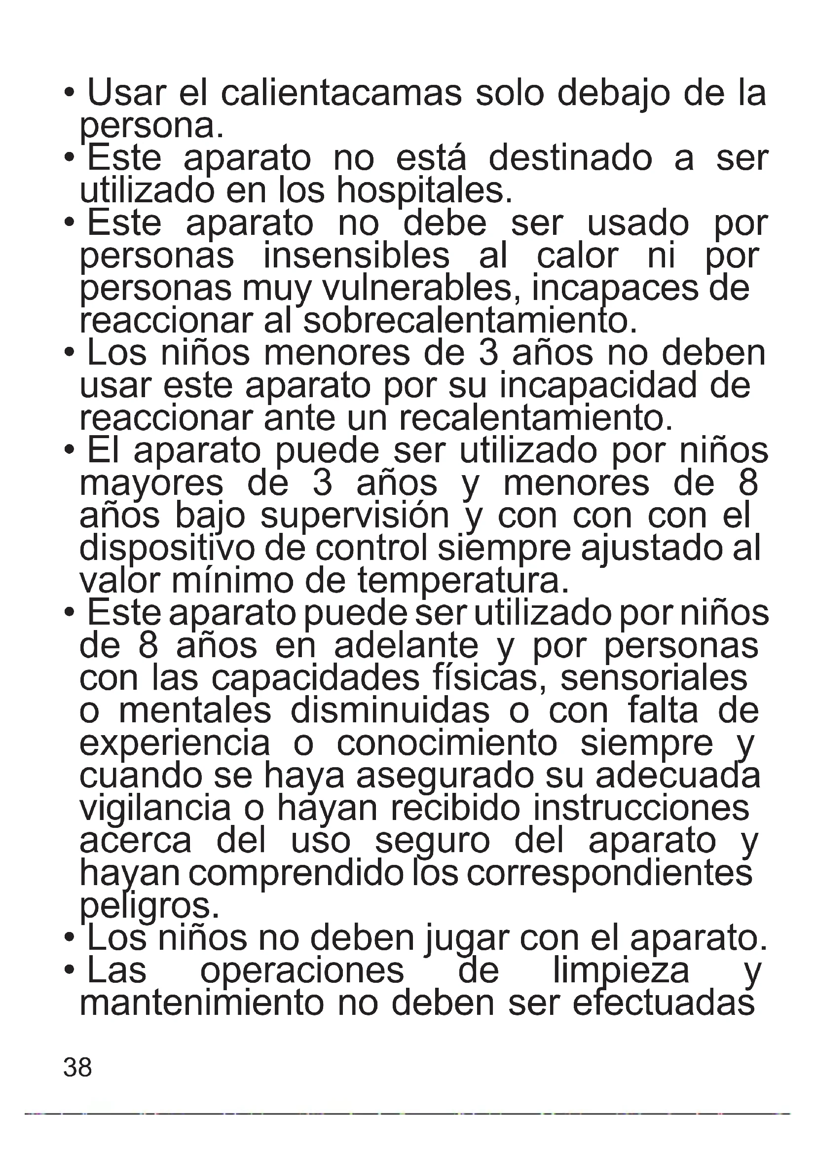 - Usar el calientacamas por encima del colchón, no usarlo por encima de supercies duras (p. Ej., sin colchón, en la red, sobre listones o en el piso).41 debe utilizar como un juguete; es un aparato eléctrico y así debe ser considerado. Antes de conectar el aparato asegurarse de que la tensión presente en la toma de corriente corresponda a la indicada en las características nominales.No utilizar el aparato en corriente continua. En el caso de que la toma y el enchufe no sean compatibles, hacer reemplazar la toma por personal calicado con una del tipo adecuado. No utilizar adaptadores o extensiones que no correspondan a las vigentes normativas de seguridad o que superen los límites de carga de la corriente. Desconectar el aparato de la red de alimentación cuando no se utiliza. No tirar el cable de alimentación o el mismo aparato para desconectar el enchufe de la toma de corriente. El uso de cualquier aparato eléctrico requiere el respeto de algunas reglas fundamentales, en particular: - No tocar el aparato con las manos mojadas o húmedas. - No dejar el aparato expuesto a la acción de agentes atmosféricos (llvia, sol). - No someterlo a choques. En caso de que se produjera un desperfecto o un funcionamiento anómalo del aparato desconectar inmediatamente el enchufe, no abrir el aparato y contactar con el establecimiento distribuidor. En caso de que no se desee utilizar más este tipo de aparato, es necesario inactivarlo cortando el cable de alimentación naturalmente después de haber desconectado la toma de corriente. Se aconseja desenrollar completamente el cable de alimentación en toda su longitud evitando de este modo eventuales recalentamientos. En caso de averías, de una intervención del fusible o del termofusible de protección o un funcionamiento anormal del aparato, desconectar la clavija de inmediato, no efectuar ninguna intervención y dirigirse a un centro de asistencia autorizado. No usar el aparato al aire libre. Por motivos de seguridad no abrir el aparato o la unidad de mando, no hay partes de servicio en su interior. Evitar el acercamiento de la unidad de mando a las fuentes de calor. Evitar que se cubra la unidad de mando o de colocarla sobre el aparato mientras funciona.42 Mantenimiento Antes de limpiar el aparato desconectarlo de la toma de corriente y dejarlo enfriar completamente. Para limpiar el conmutador utilizar un paño suave y ligeramente humedecido. No utilizar sustancias, líquidos o paños excesivamente mojados ya que las posibles inltraciones podrían dañar el aparato de modo irreparable. NO SUMERGIR NUNCA LA UNIDAD DE MANDO EN AGUA. El panel se puede lavar. Antes de hacerlo, quite la unidad de mando y respete las indicaciones de lavado que guran en las etiquetas (ver la sección de ADVERTENCIAS). No lavar en seco ni utilizar solventes químicos, ya que podrían dañar el calentador de cama y comprometer la seguridad. No lave demasiado el panel, porque puede dañarse. No vuelva a poner ni utilice el aparato antes de que esté completamente seco. Istrucciones de uso - Extender el calienta camas entre el colchón y las sábanas. - Introducir la toma del cable del conmutador en el enchufe del calienta camas. Para sacar el controlador, levantar la lengüeta de bloqueo con el dedo y tirar directamente de la clavija. No tirar del cable del controlador y no intentar tirar de la clavija del controlador sin levantar la lengüeta de bloqueo, ya que la toma se dañaría. - Evitar de colocar el conmutador debajo de la almohada o las colchas durante el uso. - Conectar el enchufe a la red. - En el cable está la unidad de control con posiciones 0-1-2-3-0: Posición 0 = APAGADO Posición 1 = temperatura más baja (para uso continuo) Posición 2 = temperatura media (para precalentamiento) Posición 3 = temperatura máxima (para precalentamiento) - Encender el calienta camas una hora antes de irse a dormir, regulando la unidad de mando en la posición 2 o 3. Mantenga el calienta camas cubiertas - ATENCIÓN: no se acueste con la centralita en posición 2 o 3 para evitar quemaduras en la piel. - Antes de irse a la cama, ponga la centralita en la posición 0. Si desea mantener la temperatura durante la noche, regule el dispositivo a la posición 1.43 ELIMINACIÓN