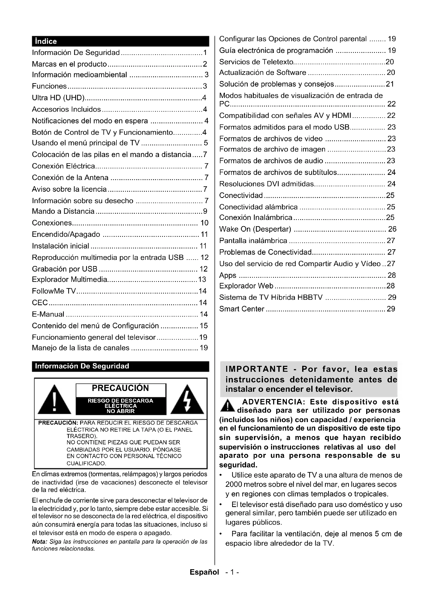 CUALIFICADO. Nota: Siga las instrucciones en pantalla para la operación de las funciones relacionadas. En climas extremos (tormentas, relámpagos) y largos periodos de inactividad (irse de vacaciones) desconecte el televisor de la red eléctrica. El enchufe de corriente sirve para desconectar el televisor de la electricidad y, por lo tanto, siempre debe estar accesible. Si el televisor no se desconecta de la red eléctrica, el dispositivo aún consumirá energía para todas las situaciones, incluso si el televisor está en modo de espera o apagado. IMPORTANTE - Por favor, lea estas instrucciones detenidamente antes de instalar o encender el televisor. ADVERTENCIA: Este dispositivo está diseñado para ser utilizado por personas (incluidos los niños) con capacidad / experiencia en el funcionamiento de un dispositivo de este tipo sin supervisión, a menos que hayan recibido supervisión o instrucciones relativas al uso del aparato por una persona responsable de su seguridad.