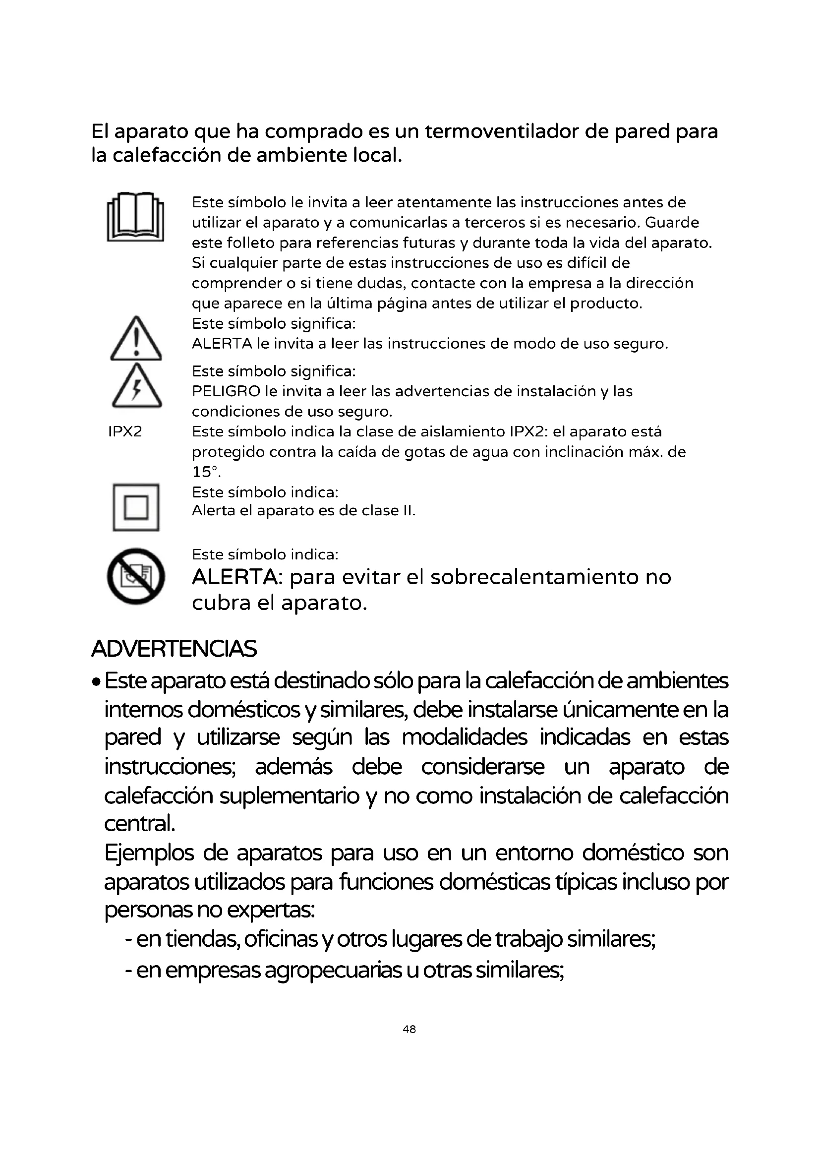 - Este aparato está destinado sólo para la calefacción de ambientes internos domésticos y similares, debe instalarse únicamente en la pared y utilizarse según las modalidades indicadas en estas instrucciones; además debe considerarse un aparato de calefacción suplementario y no como instalación de calefacción central. Ejemplos de aparatos para uso en un entorno doméstico son aparatos utilizados para funciones domésticas típicas incluso por personas no expertas: - en tiendas, oficinas y otros lugares de trabajo similares; - en empresas agropecuarias u otras similares;