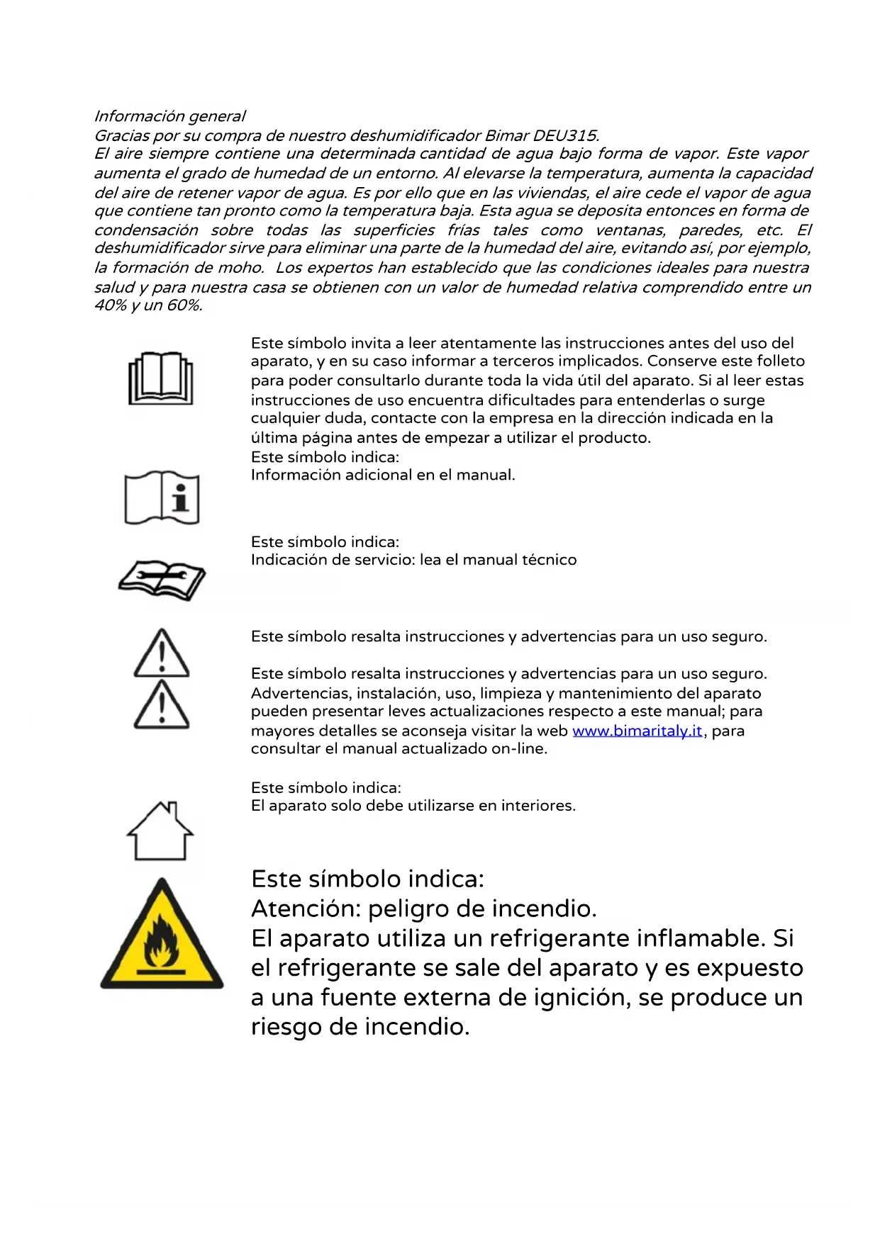 DEU315 - Deshumidificador Bimar - Manual de uso y guía de instrucciones gratis