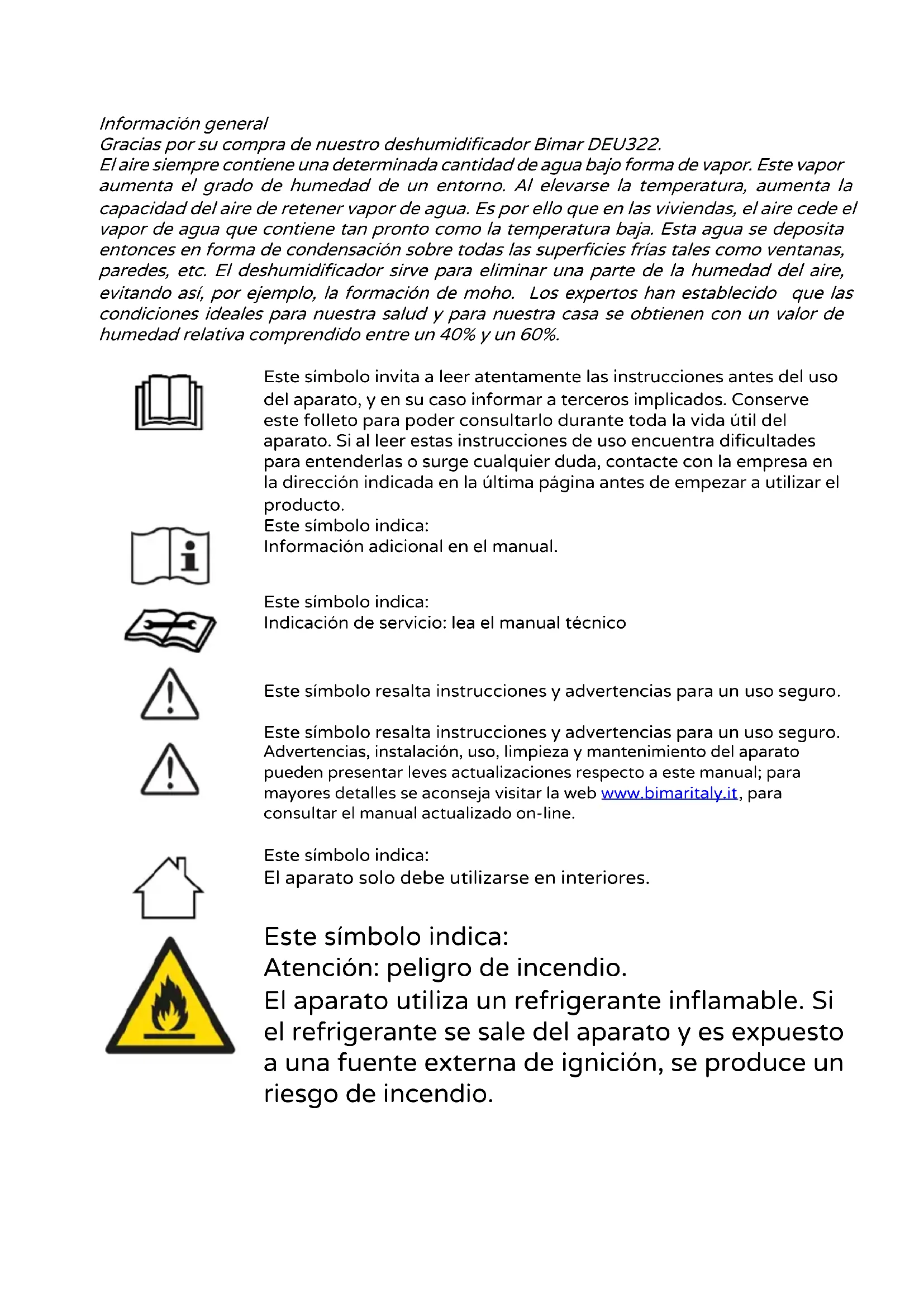 Este símbolo resalta instrucciones y advertencias para un uso seguro. Este símbolo resalta instrucciones y advertencias para un uso seguro. Advertencias, instalación, uso, limpieza y mantenimiento del aparato pueden presentar leves actualizaciones respecto a este manual; para mayores detalles se aconseja visitar la web www.bimaritaly.it , para consultar el manual actualizado on-line.