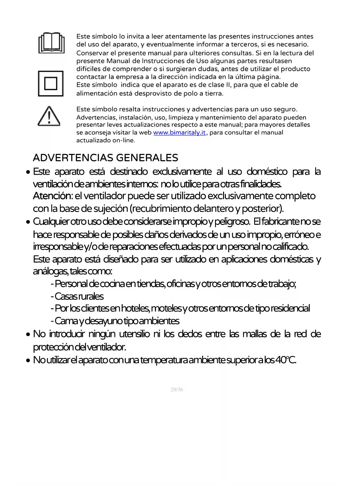 Este símbolo lo invita a leer atentamente las presentes instrucciones antes del uso del aparato, y eventualmente informar a terceros, si es necesario. Conservar el presente manual para ulteriores consultas. Si en la lectura del presente Manual de Instrucciones de Uso algunas partes resultasen difíciles de comprender o si surgieran dudas, antes de utilizar el producto contactar la empresa a la dirección indicada en la última página. Este símbolo indica que el aparato es de clase II, para que el cable de alimentación está desprovisto de polo a tierra. Este símbolo resalta instrucciones y advertencias para un uso seguro. Advertencias, instalación, uso, limpieza y mantenimiento del aparato pueden presentar leves actualizaciones respecto a este manual; para mayores detalles se aconseja visitar la web www.bimaritaly.it , para consultar el manual actualizado on-line.