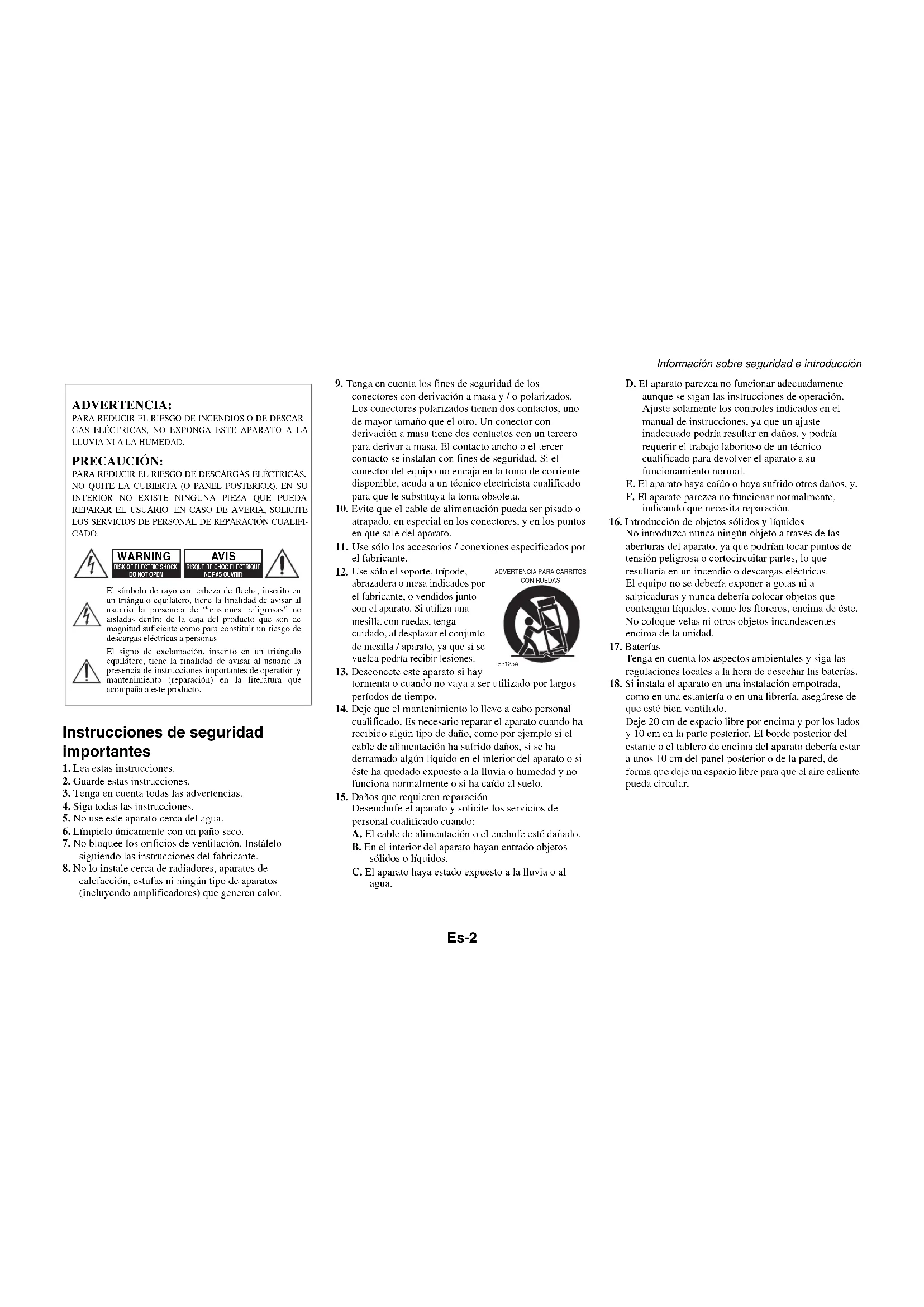 como en una estantería o en una librería, asegúrese de que esté bien ventilado. Deje 20 cm de espacio libre por encima y por los lados y 10 cm en la parte posterior. El borde posterior del estante o el tablero de encima del aparato debería estar a unos 10 cm del panel posterior o de la pared, de forma que deje un espacio libre para que el aire caliente pueda circular. ADVERTENCIA: PARA REDUCIR EL RIESGO DE INCENDIOS O DE DESCAR-GAS ELÉCTRICAS, NO EXPONGA ESTE APARATO A LA LLUVIA NI A LA HUMEDAD. PRECAUCIÓN: PARA REDUCIR EL RIESGO DE DESCARGAS ELÉCTRICAS, NO QUITE LA CUBIERTA (O PANEL POSTERIOR). EN SU INTERIOR NO EXISTE NINGUNA PIEZA QUE PUEDA REPARAR EL USUARIO. EN CASO DE AVERIA, SOLICITE LOS SERVICIOS DE PERSONAL DE REPARACIÓN CUALIFI-CADO.El símbolo de rayo con cabeza de flecha, inscrito en un triángulo equilátero, tiene la finalidad de avisar al usuario la presencia de “tensiones peligrosas” no aisladas dentro de la caja del producto que son de magnitud suficiente como para constituir un riesgo de descargas eléctricas a personasEl signo de exclamación, inscrito en un triángulo equilátero, tiene la finalidad de avisar al usuario la presencia de instrucciones importantes de operatión y mantenimiento (reparación) en la literatura que acompaña a este producto. WARNING RISK OF ELECTRIC SHOCKDO NOT OPENRISQUE DE CHOC ELECTRIQUENE PAS OUVRIR AVIS ADVERTENCIA PARA CARRITOS CON RUEDAS S3125AInformación sobre seguridad e introducción Es-3 Precauciones