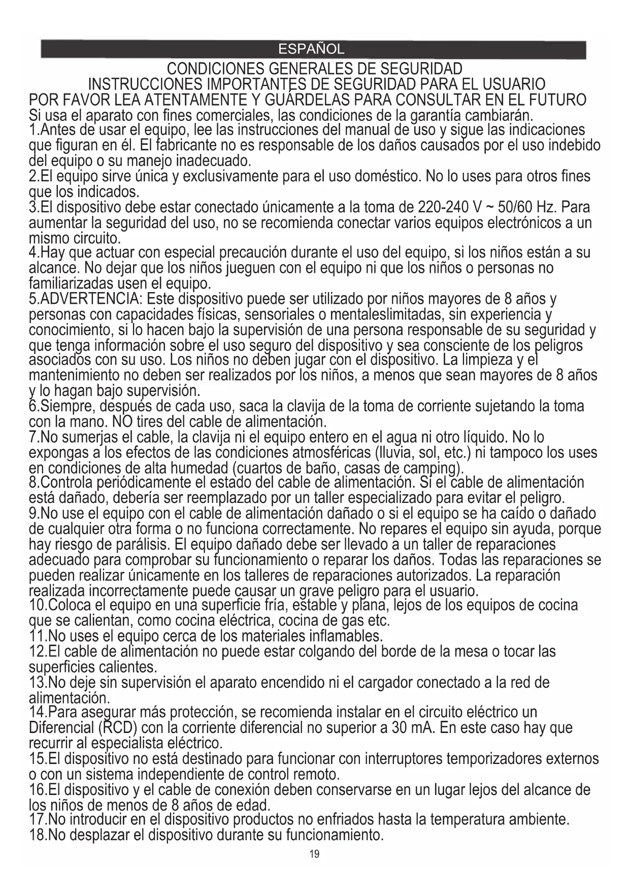 TECHNICKÉ ÚDAJE Výkon: 90 W Napájení: 100-240 V ~ 50/60 Hz Objem: 0,7 l Pracovní kapacita: 0,3L Klimatická třída: SN; N Ochrana životního prostředí. Kartón odevzdejte do sběru. Polyetylénové sáčky (PE) vyhazujte do kontejneru na plasty. Vysloužilý přístroj odevzdejte do příslušného sběrného dvoru, protože některé části zařízení mohou představovat pro životní prostředí nebezpečí. Elektrický přístroj odevzdejte tak, aby se omezilo jeho opětovné používání. Pokud jsou v přístroji baterie, vyjměte je a odevzdejte do příslušného sběrného místa zvlášť. Přístroj nevyhazujte do popelnic ani kontejneru na směsný odpad!!19 ESPAÑOL 18.No desplazar el dispositivo durante su funcionamiento. 17.No introducir en el dispositivo productos no enfriados hasta la temperatura ambiente. 16.El dispositivo y el cable de conexión deben conservarse en un lugar lejos del alcance de los niños de menos de 8 años de edad. 15.El dispositivo no está destinado para funcionar con interruptores temporizadores externos o con un sistema independiente de control remoto. 14.Para asegurar más protección, se recomienda instalar en el circuito eléctrico un Diferencial (RCD) con la corriente diferencial no superior a 30 mA. En este caso hay que recurrir al especialista eléctrico. 13.No deje sin supervisión el aparato encendido ni el cargador conectado a la red de alimentación. 12.El cable de alimentación no puede estar colgando del borde de la mesa o tocar las superficies calientes. 11.No uses el equipo cerca de los materiales inflamables. 10.Coloca el equipo en una superficie fría, estable y plana, lejos de los equipos de cocina que se calientan, como cocina eléctrica, cocina de gas etc. 9.No use el equipo con el cable de alimentación dañado o si el equipo se ha caído o dañado de cualquier otra forma o no funciona correctamente. No repares el equipo sin ayuda, porque hay riesgo de parálisis. El equipo dañado debe ser llevado a un taller de reparaciones adecuado para comprobar su funcionamiento o reparar los daños. Todas las reparaciones se pueden realizar únicamente en los talleres de reparaciones autorizados. La reparación realizada incorrectamente puede causar un grave peligro para el usuario. 8.Controla periódicamente el estado del cable de alimentación. Si el cable de alimentación está dañado, debería ser reemplazado por un taller especializado para evitar el peligro. 7.No sumerjas el cable, la clavija ni el equipo entero en el agua ni otro líquido. No lo expongas a los efectos de las condiciones atmosféricas (lluvia, sol, etc.) ni tampoco los uses en condiciones de alta humedad (cuartos de baño, casas de camping). 6.Siempre, después de cada uso, saca la clavija de la toma de corriente sujetando la toma con la mano. NO tires del cable de alimentación. 5.ADVERTENCIA: Este dispositivo puede ser utilizado por niños mayores de 8 años y personas con capacidades físicas, sensoriales o mentaleslimitadas, sin experiencia y conocimiento, si lo hacen bajo la supervisión de una persona responsable de su seguridad y que tenga información sobre el uso seguro del dispositivo y sea consciente de los peligros asociados con su uso. Los niños no deben jugar con el dispositivo. La limpieza y el mantenimiento no deben ser realizados por los niños, a menos que sean mayores de 8 años y lo hagan bajo supervisión. 4.Hay que actuar con especial precaución durante el uso del equipo, si los niños están a su alcance. No dejar que los niños jueguen con el equipo ni que los niños o personas no familiarizadas usen el equipo. 3.El dispositivo debe estar conectado únicamente a la toma de 220-240 V ~ 50/60 Hz. Para aumentar la seguridad del uso, no se recomienda conectar varios equipos electrónicos a un mismo circuito. Si usa el aparato con fines comerciales, las condiciones de la garantía cambiarán. 1.Antes de usar el equipo, lee las instrucciones del manual de uso y sigue las indicaciones que figuran en él. El fabricante no es responsable de los daños causados por el uso indebido del equipo o su manejo inadecuado. 2.El equipo sirve única y exclusivamente para el uso doméstico. No lo uses para otros fines que los indicados. POR FAVOR LEA ATENTAMENTE Y GUÁRDELAS PARA CONSULTAR EN EL FUTURO INSTRUCCIONES IMPORTANTES DE SEGURIDAD PARA EL USUARIO