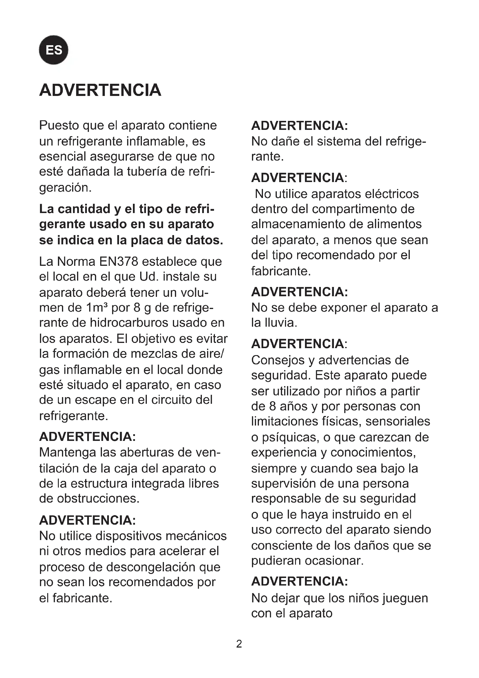 FRPuesto que el aparato contiene un refrigerante inamable, es esencial asegurarse de que no esté dañada la tubería de refri- geración. La cantidad y el tipo de refri- gerante usado en su aparato se indica en la placa de datos. La Norma EN378 establece que el local en el que Ud. instale su aparato deberá tener un volu- men de 1m³ por 8 g de refrige- rante de hidrocarburos usado en los aparatos. El objetivo es evitar la formación de mezclas de aire/ gas inamable en el local donde esté situado el aparato, en caso de un escape en el circuito del refrigerante. ADVERTENCIA: Mantenga las aberturas de ven- tilación de la caja del aparato o de la estructura integrada libres de obstrucciones. ADVERTENCIA: No utilice dispositivos mecánicos ni otros medios para acelerar el proceso de descongelación que no sean los recomendados por el fabricante. ADVERTENCIA: No dañe el sistema del refrige- rante. ADVERTENCIA: No utilice aparatos eléctricos dentro del compartimento de almacenamiento de alimentos del aparato, a menos que sean del tipo recomendado por el fabricante. ADVERTENCIA: No se debe exponer el aparato a la lluvia. ADVERTENCIA: Consejos y advertencias de seguridad. Este aparato puede ser utilizado por niños a partir de 8 años y por personas con limitaciones físicas, sensoriales o psíquicas, o que carezcan de experiencia y conocimientos, siempre y cuando sea bajo la supervisión de una persona responsable de su seguridad o que le haya instruido en el uso correcto del aparato siendo consciente de los daños que se pudieran ocasionar. ADVERTENCIA: No dejar que los niños jueguen con el aparato ADVERTENCIA
