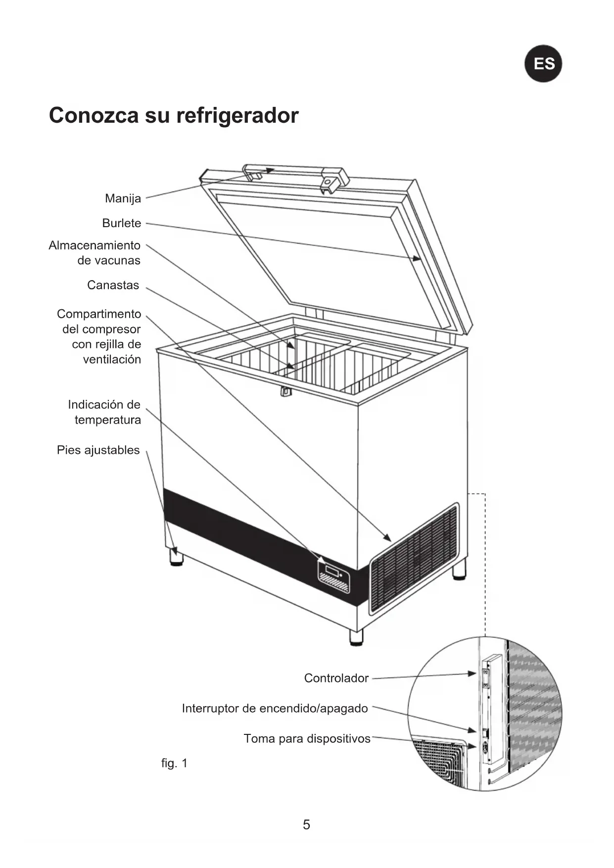 ESConozca su refrigerador Manija Burlete Compartimento del compresor con rejilla de ventilación Indicación de temperatura Pies ajustables Canastas Almacenamiento de vacunas g. 1 Controlador Interruptor de encendido/apagado Toma para dispositivos