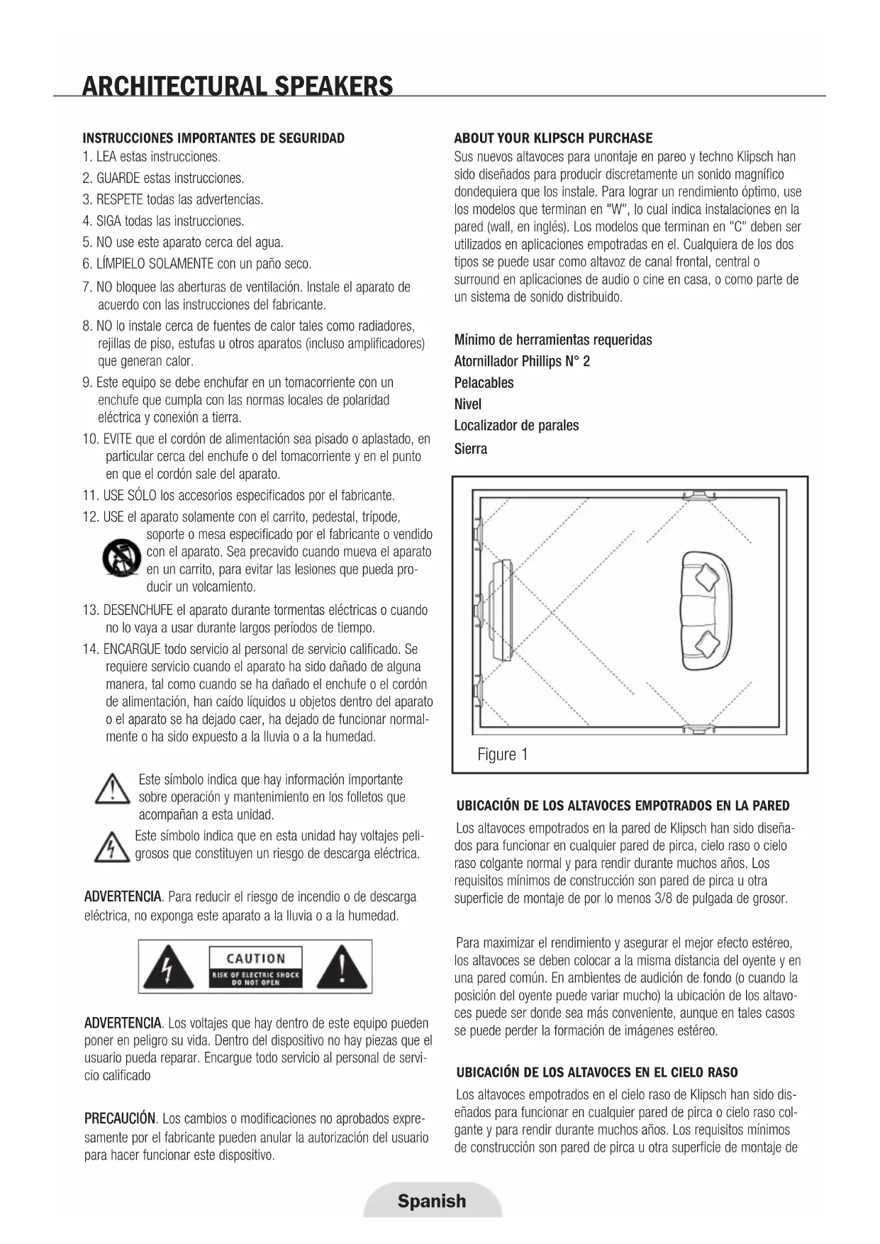 Sus nuevos altavoces para unontaje en pareo y techno Klipsch han sido diseñados para producir discretamente un sonido magnífico dondequiera que los instale. Para lograr un rendimiento óptimo, use los modelos que terminan en "W", lo cual indica instalaciones en la pared (wall, en inglés). Los modelos que terminan en "C" deben ser utilizados en aplicaciones empotradas en el. Cualquiera de los dos tipos se puede usar como altavoz de canal frontal, central o surround en aplicaciones de audio o cine en casa, o como parte de un sistema de sonido distribuido. Mínimo de herramientas requeridas Atornillador Phillips N° 2 Pelacables Nivel Localizador de parales Sierra UBICACIÓN DE LOS ALTAVOCES EMPOTRADOS EN LA PARED Los altavoces empotrados en la pared de Klipsch han sido diseña- dos para funcionar en cualquier pared de pirca, cielo raso o cielo raso colgante normal y para rendir durante muchos años. Los requisitos mínimos de construcción son pared de pirca u otra superficie de montaje de por lo menos 3/8 de pulgada de grosor. Para maximizar el rendimiento y asegurar el mejor efecto estéreo, los altavoces se deben colocar a la misma distancia del oyente y en una pared común. En ambientes de audición de fondo (o cuando la posición del oyente puede variar mucho) la ubicación de los altavo- ces puede ser donde sea más conveniente, aunque en tales casos se puede perder la formación de imágenes estéreo. UBICACIÓN DE LOS ALTAVOCES EN EL CIELO RASO Los altavoces empotrados en el cielo raso de Klipsch han sido dis- eñados para funcionar en cualquier pared de pirca o cielo raso col- gante y para rendir durante muchos años. Los requisitos mínimos de construcción son pared de pirca u otra superficie de montaje de Spanish Figure 1por lo menos 3/8 de pulgada de grosor. En las instalaciones en cielo raso colgante, las planchas de cielo raso normales son de 2 pies x 4 pies y de 2 pie x 2 pie, y son de materiales de baja densi- dad que, con el tiempo, pueden abombarse o vibrar de manera audible. Para maximizar el rendimiento acústico de los altavoces empotrados en el cielo raso, Klipsch recomienda que cambie los paneles originales con madera terciada (contraenchapada) o Plancha de Fibra de Densidad Media (Medium Density Fiberboard, MDF) de 1/2 plg. a 3/4 plg de grosor.
