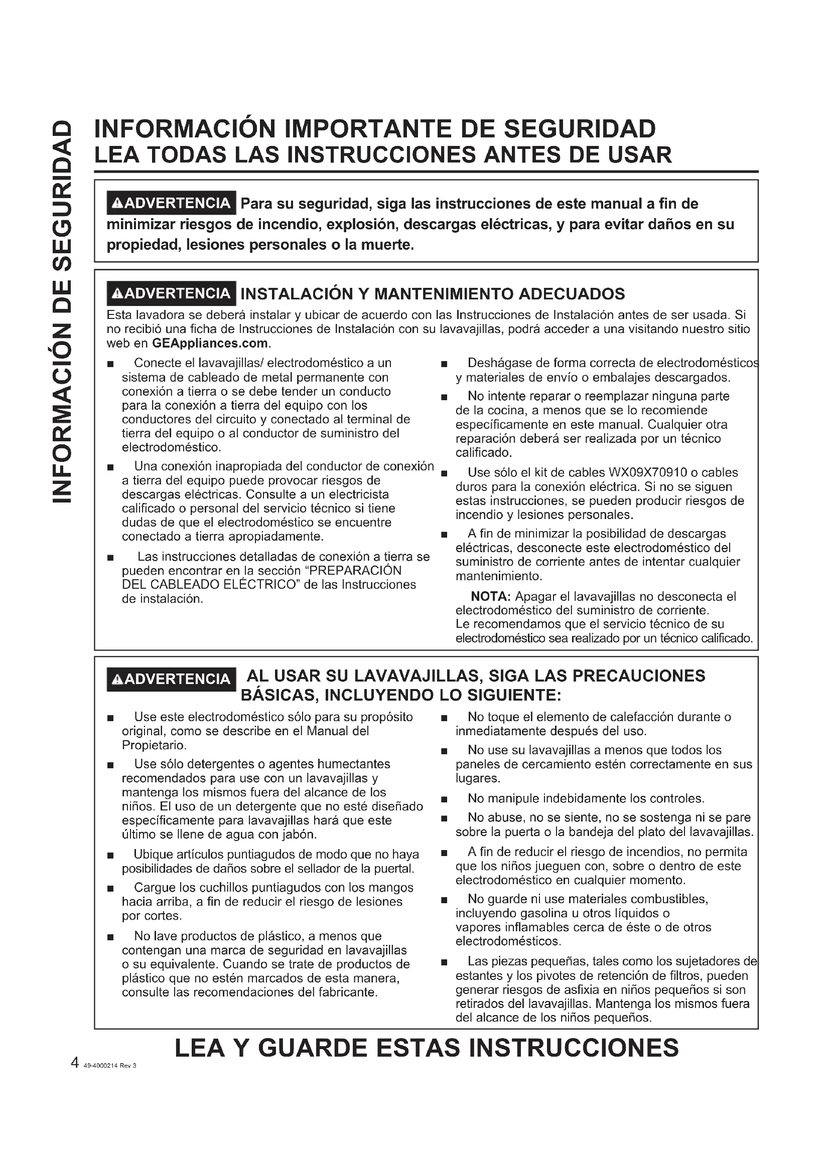 Esta lavadora se deberá instalar y ubicar de acuerdo con las Instrucciones de Instalación antes de ser usada. Si no recibió una ficha de Instrucciones de Instalación con su lavavajillas, podrá acceder a una visitando nuestro sitio web en GEAppliances.com.Ŷ &RQHFWHHOODYDYDMLOODVHOHFWURGRPpVWLFRDXQsistema de cableado de metal permanente con conexión a tierra o se debe tender un conducto para la conexión a tierra del equipo con los conductores del circuito y conectado al terminal de tierra del equipo o al conductor de suministro del electrodoméstico.Ŷ 8QDFRQH[LyQLQDSURSLDGDGHOFRQGXFWRUGHFRQH[LyQa tierra del equipo puede provocar riesgos de descargas eléctricas. Consulte a un electricista calificado o personal del servicio técnico si tiene dudas de que el electrodoméstico se encuentre conectado a tierra apropiadamente.Ŷ /DVLQVWUXFFLRQHVGHWDOODGDVGHFRQH[LyQDWLHUUDVHpueden encontrar en la sección “PREPARACIÓN '(/&$%/($'2(/e&75,&2´GHODV,QVWUXFFLRQHVde instalación.Ŷ 'HVKiJDVHGHIRUPDFRUUHFWDGHHOHFWURGRPpVWLFRVy materiales de envío o embalajes descargados.Ŷ 1RLQWHQWHUHSDUDURUHHPSOD]DUQLQJXQDSDUWHde la cocina, a menos que se lo recomiende específicamente en este manual. Cualquier otra reparación deberá ser realizada por un técnico calificado.Ŷ 8VHVyORHONLWGHFDEOHV:;;RFDEOHVduros para la conexión eléctrica. Si no se siguen estas instrucciones, se pueden producir riesgos de incendio y lesiones personales.Ŷ $ILQGHPLQLPL]DUODSRVLELOLGDGGHGHVFDUJDVeléctricas, desconecte este electrodoméstico del suministro de corriente antes de intentar cualquier mantenimiento. NOTA: Apagar el lavavajillas no desconecta el electrodoméstico del suministro de corriente. /HUHFRPHQGDPRVTXHHOVHUYLFLRWpFQLFRGHVXelectrodoméstico sea realizado por un técnico calificado. ADVERTENCIA AL USAR SU LAVAVAJILLAS, SIGA LAS PRECAUCIONES BÁSICAS, INCLUYENDO LO SIGUIENTE: Ŷ 8VHHVWHHOHFWURGRPpVWLFRVyORSDUDVXSURSyVLWRoriginal, como se describe en el Manual del Propietario.Ŷ 8VHVyORGHWHUJHQWHVRDJHQWHVKXPHFWDQWHVrecomendados para use con un lavavajillas y mantenga los mismos fuera del alcance de los niños. El uso de un detergente que no esté diseñado específicamente para lavavajillas hará que este último se llene de agua con jabón.Ŷ 8ELTXHDUWtFXORVSXQWLDJXGRVGHPRGRTXHQRKD\Dposibilidades de daños sobre el sellador de la puertal.Ŷ &DUJXHORVFXFKLOORVSXQWLDJXGRVFRQORVPDQJRVhacia arriba, a fin de reducir el riesgo de lesiones por cortes.Ŷ 1RODYHSURGXFWRVGHSOiVWLFRDPHQRVTXHcontengan una marca de seguridad en lavavajillas o su equivalente. Cuando se trate de productos de plástico que no estén marcados de esta manera, consulte las recomendaciones del fabricante.Ŷ 1RWRTXHHOHOHPHQWRGHFDOHIDFFLyQGXUDQWHRinmediatamente después del uso.Ŷ 1RXVHVXODYDYDMLOODVDPHQRVTXHWRGRVORVpaneles de cercamiento estén correctamente en sus lugares.Ŷ 1RPDQLSXOHLQGHELGDPHQWHORVFRQWUROHVŶ 1RDEXVHQRVHVLHQWHQRVHVRVWHQJDQLVHSDUHsobre la puerta o la bandeja del plato del lavavajillas.Ŷ $ILQGHUHGXFLUHOULHVJRGHLQFHQGLRVQRSHUPLWDque los niños jueguen con, sobre o dentro de este electrodoméstico en cualquier momento.Ŷ 1RJXDUGHQLXVHPDWHULDOHVFRPEXVWLEOHVincluyendo gasolina u otros líquidos o vapores inflamables cerca de éste o de otros electrodomésticos.Ŷ /DVSLH]DVSHTXHxDVWDOHVFRPRORVVXMHWDGRUHVGHestantes y los pivotes de retención de filtros, pueden generar riesgos de asfixia en niños pequeños si son retirados del lavavajillas. Mantenga los mismos fuera del alcance de los niños pequeños.49-4000214 Rev 3 5