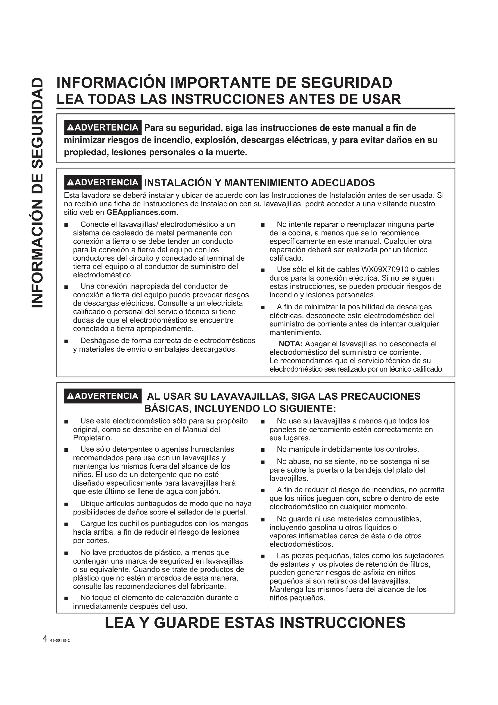 Esta lavadora se deberá instalar y ubicar de acuerdo con las Instrucciones de Instalación antes de ser usada. Si no recibió una ficha de Instrucciones de Instalación con su lavavajillas, podrá acceder a una visitando nuestro sitio web en GEAppliances.com.Ŷ &RQHFWHHOODYDYDMLOODVHOHFWURGRPpVWLFRDXQsistema de cableado de metal permanente con conexión a tierra o se debe tender un conducto para la conexión a tierra del equipo con los conductores del circuito y conectado al terminal de tierra del equipo o al conductor de suministro del electrodoméstico.Ŷ 8QDFRQH[LyQLQDSURSLDGDGHOFRQGXFWRUGHconexión a tierra del equipo puede provocar riesgos de descargas eléctricas. Consulte a un electricista calificado o personal del servicio técnico si tiene dudas de que el electrodoméstico se encuentre conectado a tierra apropiadamente.Ŷ 'HVKiJDVHGHIRUPDFRUUHFWDGHHOHFWURGRPpVWLFRVy materiales de envío o embalajes descargados.Ŷ 1RLQWHQWHUHSDUDURUHHPSOD]DUQLQJXQDSDUWHde la cocina, a menos que se lo recomiende específicamente en este manual. Cualquier otra reparación deberá ser realizada por un técnico calificado.Ŷ 8VHVyORHONLWGHFDEOHV:;;RFDEOHVduros para la conexión eléctrica. Si no se siguen estas instrucciones, se pueden producir riesgos de incendio y lesiones personales.Ŷ $ILQGHPLQLPL]DUODSRVLELOLGDGGHGHVFDUJDVeléctricas, desconecte este electrodoméstico del suministro de corriente antes de intentar cualquier mantenimiento. NOTA: Apagar el lavavajillas no desconecta el electrodoméstico del suministro de corriente. Le recomendamos que el servicio técnico de su electrodoméstico sea realizado por un técnico calificado. ADVERTENCIA AL USAR SU LAVAVAJILLAS, SIGA LAS PRECAUCIONES BÁSICAS, INCLUYENDO LO SIGUIENTE: Ŷ 8VHHVWHHOHFWURGRPpVWLFRVyORSDUDVXSURSyVLWRoriginal, como se describe en el Manual del Propietario.Ŷ 8VHVyORGHWHUJHQWHVRDJHQWHVKXPHFWDQWHVrecomendados para use con un lavavajillas y mantenga los mismos fuera del alcance de los niños. El uso de un detergente que no esté diseñado específicamente para lavavajillas hará que este último se llene de agua con jabón.Ŷ 8ELTXHDUWtFXORVSXQWLDJXGRVGHPRGRTXHQRKD\Dposibilidades de daños sobre el sellador de la puertal.Ŷ &DUJXHORVFXFKLOORVSXQWLDJXGRVFRQORVPDQJRVhacia arriba, a fin de reducir el riesgo de lesiones por cortes.Ŷ 1RODYHSURGXFWRVGHSOiVWLFRDPHQRVTXHcontengan una marca de seguridad en lavavajillas o su equivalente. Cuando se trate de productos de plástico que no estén marcados de esta manera, consulte las recomendaciones del fabricante.Ŷ 1RWRTXHHOHOHPHQWRGHFDOHIDFFLyQGXUDQWHRinmediatamente después del uso.Ŷ 1RXVHVXODYDYDMLOODVDPHQRVTXHWRGRVORVpaneles de cercamiento estén correctamente en sus lugares.Ŷ 1RPDQLSXOHLQGHELGDPHQWHORVFRQWUROHVŶ 1RDEXVHQRVHVLHQWHQRVHVRVWHQJDQLVHpare sobre la puerta o la bandeja del plato del lavavajillas.Ŷ $ILQGHUHGXFLUHOULHVJRGHLQFHQGLRVQRSHUPLWDque los niños jueguen con, sobre o dentro de este electrodoméstico en cualquier momento.Ŷ 1RJXDUGHQLXVHPDWHULDOHVFRPEXVWLEOHVincluyendo gasolina u otros líquidos o vapores inflamables cerca de éste o de otros electrodomésticos.Ŷ /DVSLH]DVSHTXHxDVWDOHVFRPRORVVXMHWDGRUHVde estantes y los pivotes de retención de filtros, pueden generar riesgos de asfixia en niños pequeños si son retirados del lavavajillas. Mantenga los mismos fuera del alcance de los niños pequeños.49-55119-2 5