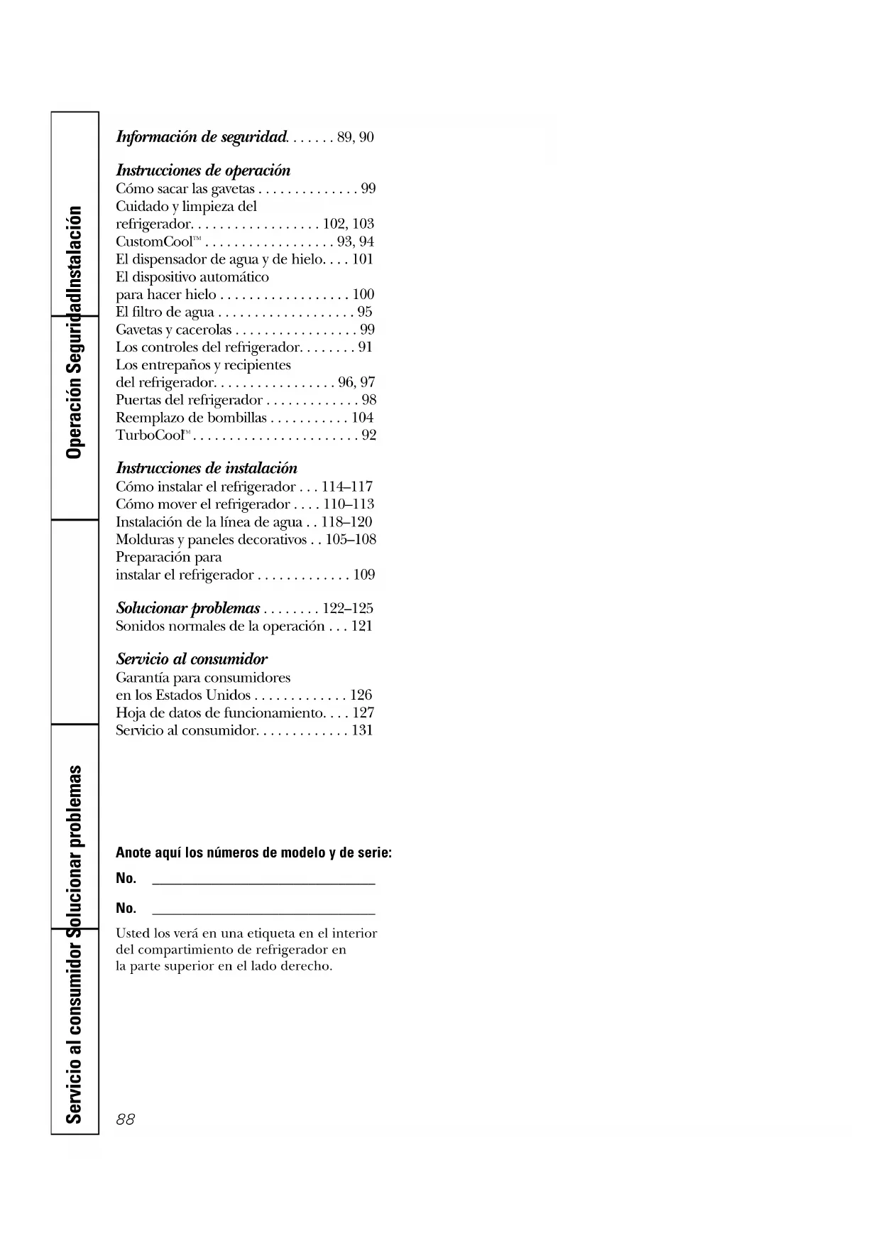 Anote aquí los números de modelo y de serie: No. ______________________________ No. ______________________________ Usted los verá en una etiqueta en el interior del compartimiento de refrigerador en la parte superior en el lado derecho.INFORMACIONES IMPORTANTES DE SEGURIDAD. LEA PRIMERO TODAS LAS INSTRUCCIONES. GEAppliances.com ¡ADVERTENCIA! Use este aparato sólo para los fines que se describen en este Manual del propietario.