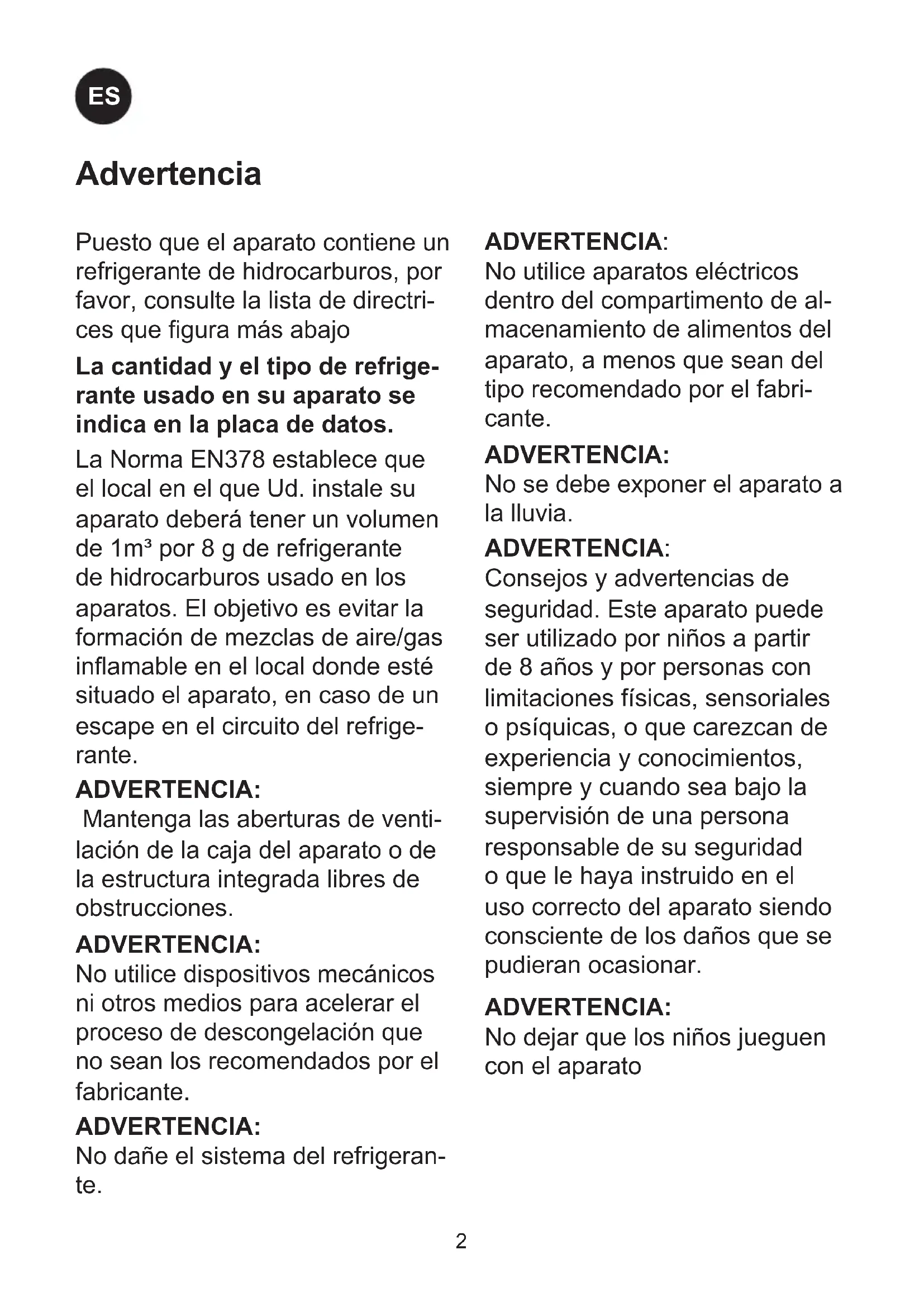 Advertencia ADVERTENCIA: No utilice aparatos eléctricos dentro del compartimento de al- macenamiento de alimentos del aparato, a menos que sean del tipo recomendado por el fabri- cante. ADVERTENCIA: No se debe exponer el aparato a la lluvia. ADVERTENCIA: Consejos y advertencias de seguridad. Este aparato puede ser utilizado por niños a partir de 8 años y por personas con limitaciones físicas, sensoriales o psíquicas, o que carezcan de experiencia y conocimientos, siempre y cuando sea bajo la supervisión de una persona responsable de su seguridad o que le haya instruido en el uso correcto del aparato siendo consciente de los daños que se pudieran ocasionar. ADVERTENCIA: No dejar que los niños jueguen con el aparato Puesto que el aparato contiene un refrigerante de hidrocarburos, por favor, consulte la lista de directri- ces que gura más abajo La cantidad y el tipo de refrige- rante usado en su aparato se indica en la placa de datos. La Norma EN378 establece que el local en el que Ud. instale su aparato deberá tener un volumen de 1m³ por 8 g de refrigerante de hidrocarburos usado en los aparatos. El objetivo es evitar la formación de mezclas de aire/gas inamable en el local donde esté situado el aparato, en caso de un escape en el circuito del refrige- rante. ADVERTENCIA: Mantenga las aberturas de venti- lación de la caja del aparato o de la estructura integrada libres de obstrucciones. ADVERTENCIA: No utilice dispositivos mecánicos ni otros medios para acelerar el proceso de descongelación que no sean los recomendados por el fabricante. ADVERTENCIA: No dañe el sistema del refrigeran- te.3