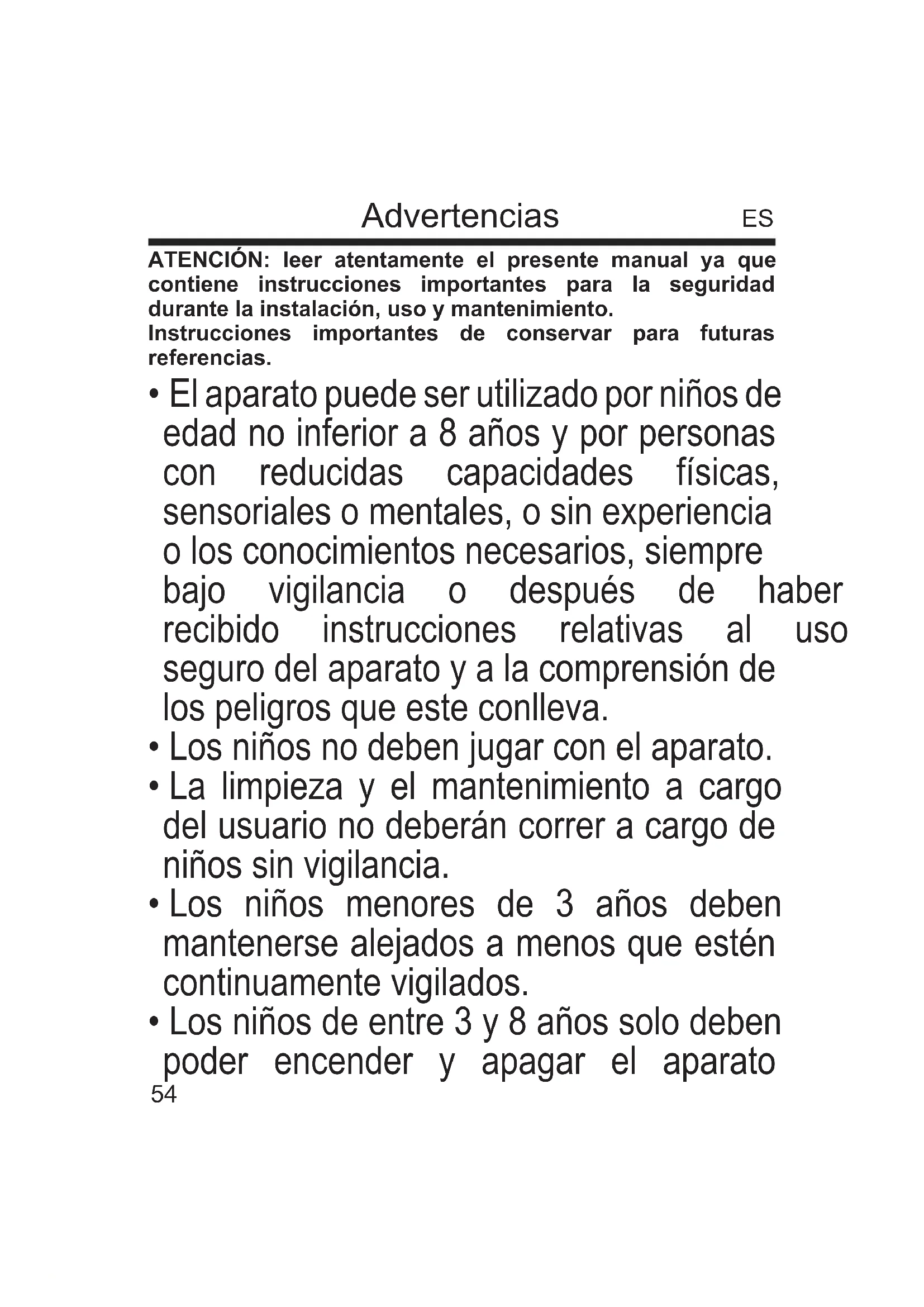 - Los niños de entre 3 y 8 años solo deben poder encender y apagar el aparato ES55 siempre que esté colocado o instalado en su posición normal de funcionamiento y que estén vigilados o hayan sido instruidos sobre el uso seguro del aparato y entiendan los peligros.