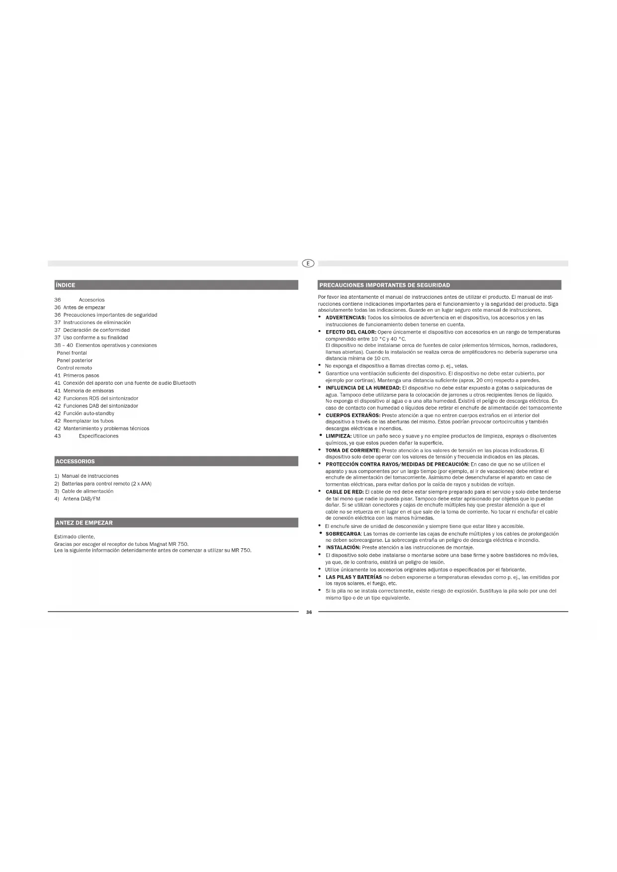 - Si la pila no se instala correctamente, existe riesgo de explosión. Sustituya la pila solo por una del mismo tipo o de un tipo equivalente. ÍNDICE 36 Accesorios 36 Antes de empezar 36 Precauciones importantes de seguridad 37 Instrucciones de eliminación 37 Declaración de conformidad 37 Uso conforme a su finalidad 38 – 40 Elementos operativos y conexiones Panel frontal Panel posterior Control remoto 41 Primeros pasos 41 Conexión del aparato con una fuente de audio Bluetooth 41 Memoria de emisoras 42 Funciones RDS del sintonizador 42 Funciones DAB del sintonizador 42 Función auto-standby 42 Reemplazar los tubos 42 Mantenimiento y problemas técnicos 43 Especificaciones ACCESSORIOS