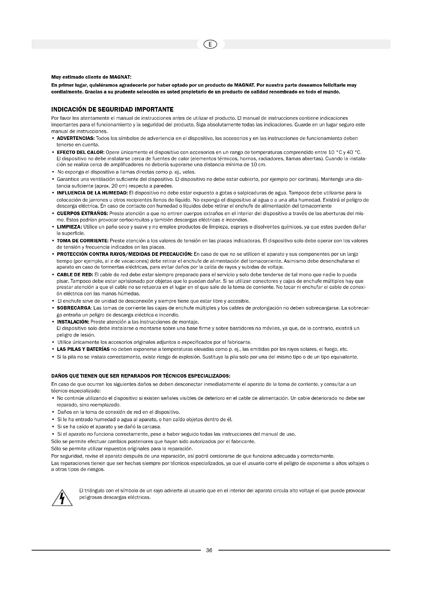- Si el aparato no funciona correctamente, pese a haber seguido todas las instrucciones del manual de uso. Sólo se permite efectuar cambios posteriores que hayan sido autorizados por el fabricante. Sólo se permite utilizar repuestos originales para la reparación. Por seguridad, revise el aparato después de una reparación, así podrá cerciorarse de que funciona adecuada y correctamente. Las reparaciones tienen que ser hechas siempre por técnicos especializados, ya que el usuario corre el peligro de exponerse a altos voltajes o a otros tipos de riesgos. El triángulo con el símbolo de un rayo advierte al usuario que en el interior del aparato circula alto voltaje el que puede provocar peligrosas descargas eléctricas.37 El triángulo con el símbolo de exclamación le señala al usuario que en el manual de instrucciones adjuntado, se pueden encontrar importantes consejos para el funcionamiento y la mantención (reparaciones) del producto los que en todo caso tienen que considerarse.