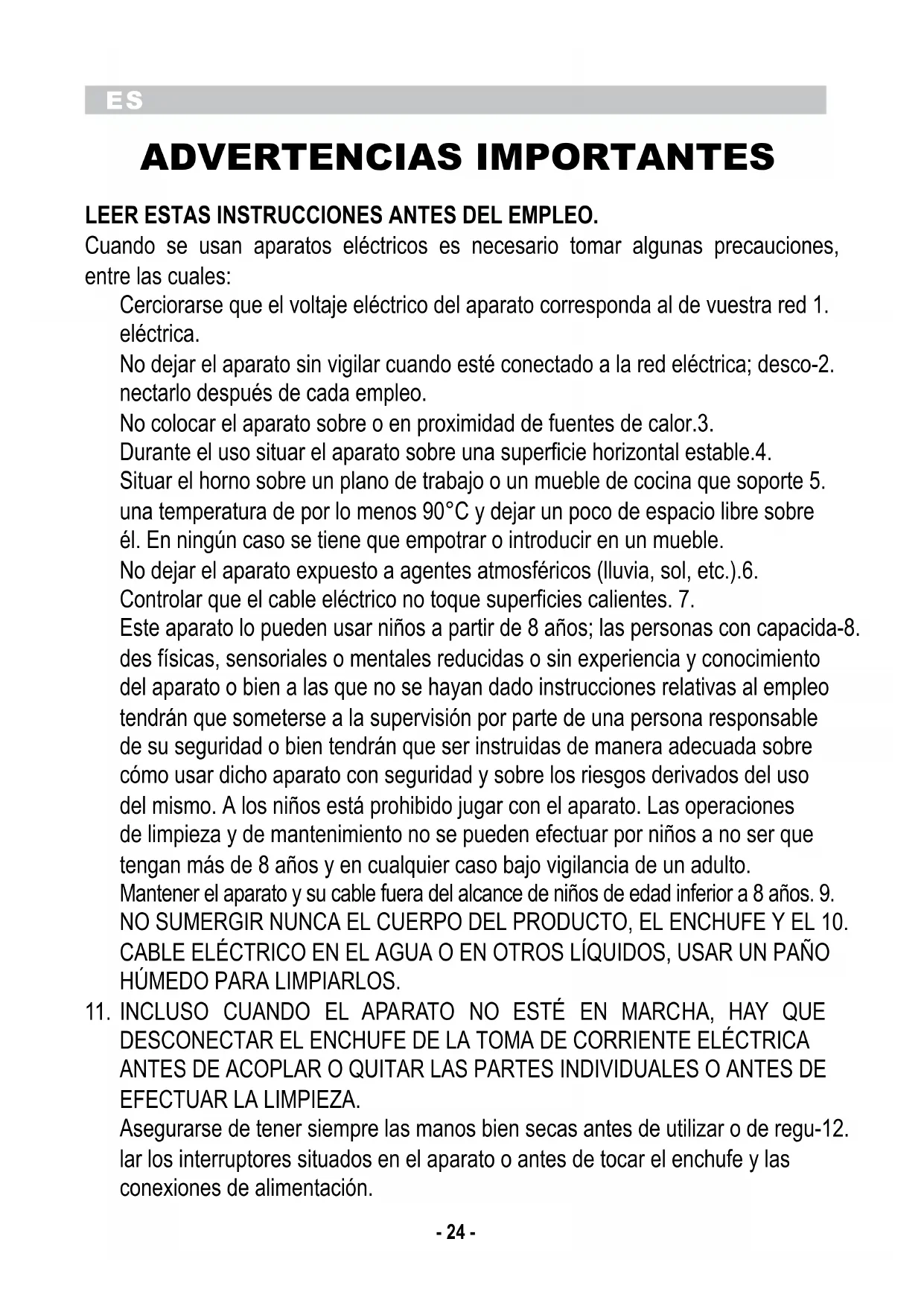 ADVERTENCIAS IMPORTANTES LEER ESTAS INSTRUCCIoNES ANTES DEL EMPLEo. Cuando se usan aparatos eléctricos es necesario tomar algunas precauciones, entre las cuales: Cerciorarse que el voltaje eléctrico del aparato corresponda al de vuestra red 1. eléctrica. No dejar el aparato sin vigilar cuando esté conectado a la red eléctrica; desco-2. nectarlo después de cada empleo. No colocar el aparato sobre o en proximidad de fuentes de calor.3. Durante el uso situar el aparato sobre una superficie horizontal estable.4. Situar el horno sobre un plano de trabajo o un mueble de cocina que soporte 5. una temperatura de por lo menos 90°C y dejar un poco de espacio libre sobre él. En ningún caso se tiene que empotrar o introducir en un mueble. No dejar el aparato expuesto a agentes atmosféricos (lluvia, sol, etc.).6. Controlar que el cable eléctrico no toque superficies calientes. 7. Este aparato lo pueden usar niños a partir de 8 años; las personas con capacida-8. des físicas, sensoriales o mentales reducidas o sin experiencia y conocimiento del aparato o bien a las que no se hayan dado instrucciones relativas al empleo tendrán que someterse a la supervisión por parte de una persona responsable de su seguridad o bien tendrán que ser instruidas de manera adecuada sobre cómo usar dicho aparato con seguridad y sobre los riesgos derivados del uso del mismo. A los niños está prohibido jugar con el aparato. Las operaciones de limpieza y de mantenimiento no se pueden efectuar por niños a no ser que tengan más de 8 años y en cualquier caso bajo vigilancia de un adulto. Mantener el aparato y su cable fuera del alcance de niños de edad inferior a 8 años. 9. NO SUMERGIR NUNCA EL CUERPO DEL PRODUCTO, EL ENCHUFE Y EL 10. CABLE ELÉCTRICO EN EL AGUA O EN OTROS LÍQUIDOS, USAR UN PAÑO HÚMEDO PARA LIMPIARLOS. INCLUSO CUANDO EL APARATO NO ESTÉ EN MARCHA, HAY QUE 11. DESCONECTAR EL ENCHUFE DE LA TOMA DE CORRIENTE ELÉCTRICA ANTES DE ACOPLAR O QUITAR LAS PARTES INDIVIDUALES O ANTES DE EFECTUAR LA LIMPIEZA. Asegurarse de tener siempre las manos bien secas antes de utilizar o de regu-12. lar los interruptores situados en el aparato o antes de tocar el enchufe y las conexiones de alimentación.ES