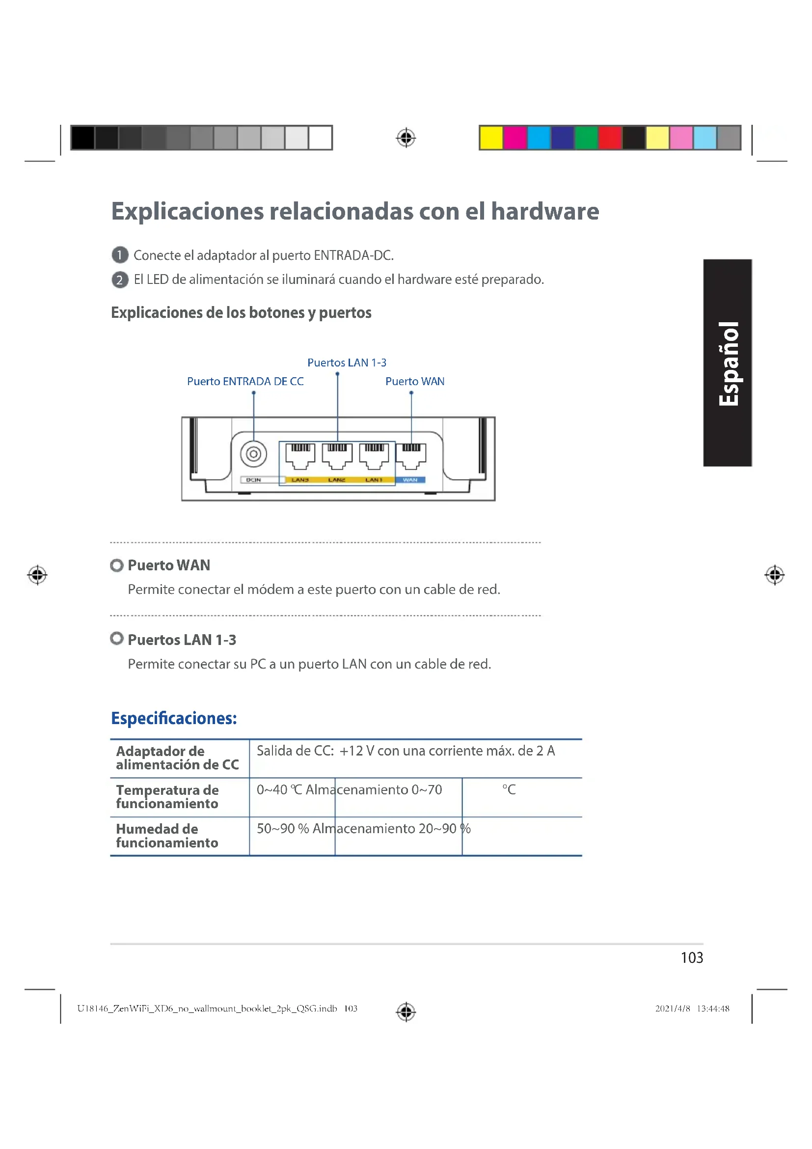 NOTAS: Para minimizar las interferencias, mantenga los routers alejados de dispositivos como teléfonos inalámbricos, dispositivos Bluetooth y hornos de microondas. Le recomendamos que coloque los routers en una ubicación abierta o espaciosa. Indicaciones del LED ZenWiFi XD6 Azul permanente: Su ZenWiFi XD6 está preparado para la conguración. Amarillo permanente: La señal entre el enrutador ZenWiFi XD6 y el nodo es débil. Rojo permanente: El enrutador ZenWiFi XD6 no tiene conexión a Internet. / El nodo está desconectado del enrutador. Blanco permanente: Su ZenWiFi XD6 está conectado y funciona perfectamente. U18146_ZenWiFi_XD6_no_wallmount_booklet_2pk_QSG.indb 106U18146_ZenWiFi_XD6_no_wallmount_booklet_2pk_QSG.indb 106 2021/4/8 13:44:492021/4/8 13:44:49107 Español Preguntas más frecuentes