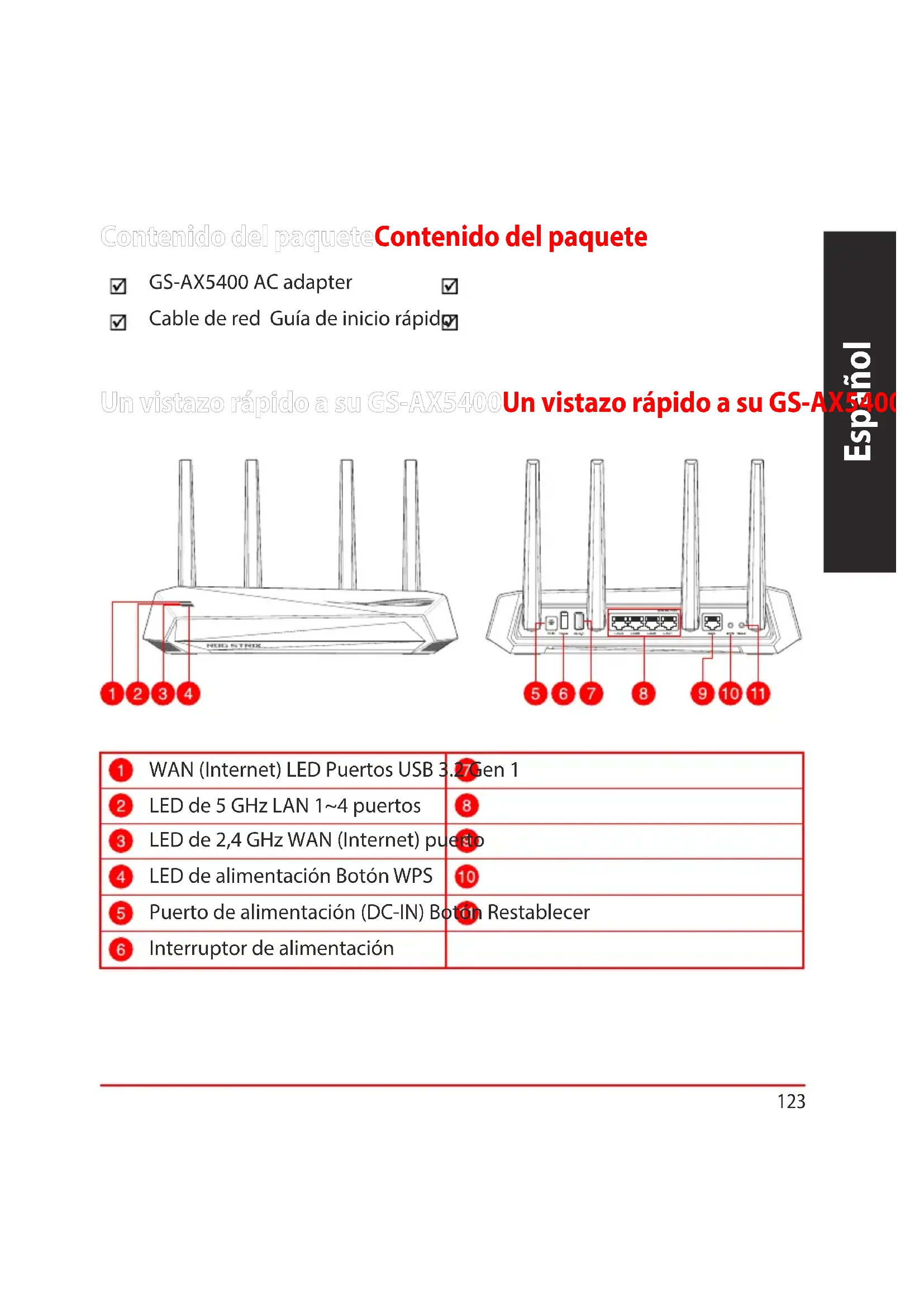 - Puteți obține manualul de utilizare online la adresa https://www.asus.com/ support ASUS Router ASUS Router123 Español Un vistazo rápido a su GS-AX5400Un vistazo rápido a su GS-AX5400 Contenido del paqueteContenido del paquete GS-AX5400 AC adapter Cable de red Guía de inicio rápido WAN (Internet) LED Puertos USB 3.2 Gen 1 LED de 5 GHz LAN 1~4 puertos LED de 2,4 GHz WAN (Internet) puerto LED de alimentación Botón WPS Puerto de alimentación (DC-IN) Botón Restablecer Interruptor de alimentación124 Español Ubicar el router inalámbricoUbicar el router inalámbrico Para conseguir la mejor transmisión de señal inalámbrica entre el router inalámbrico y los dispositivos de red conectados a él, asegúrese de: