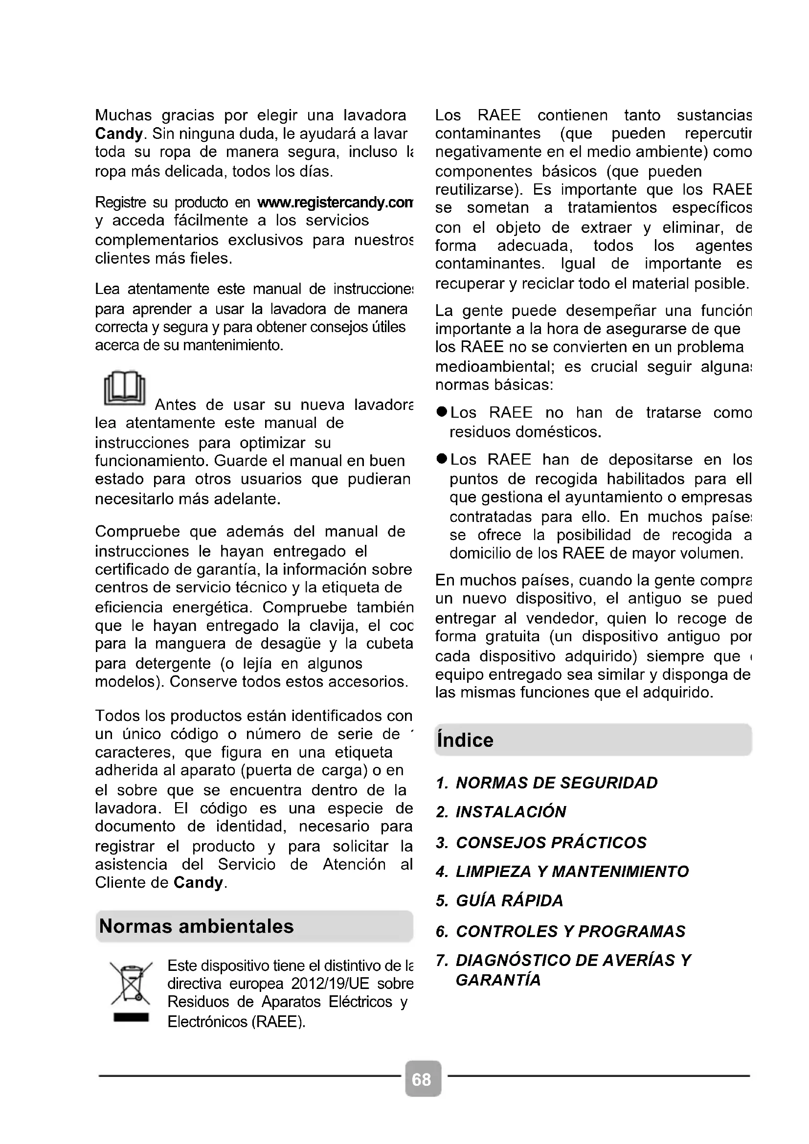 Registre su producto en www.registercandy.com y acceda fácilmente a los servicios complementarios exclusivos para nuestros clientes más fieles. Lea atentamente este manual de instrucciones para aprender a usar la lavadora de manera correcta y segura y para obtener consejos útiles acerca de su mantenimiento. Antes de usar su nueva lavadora, lea atentamente este manual de instrucciones para optimizar su funcionamiento. Guarde el manual en buen estado para otros usuarios que pudieran necesitarlo más adelante. Compruebe que además del manual de instrucciones le hayan entregado el certificado de garantía, la información sobre centros de servicio técnico y la etiqueta de eficiencia energética. Compruebe también que le hayan entregado la clavija, el codo para la manguera de desagüe y la cubeta para detergente (o lejía en algunos modelos). Conserve todos estos accesorios.