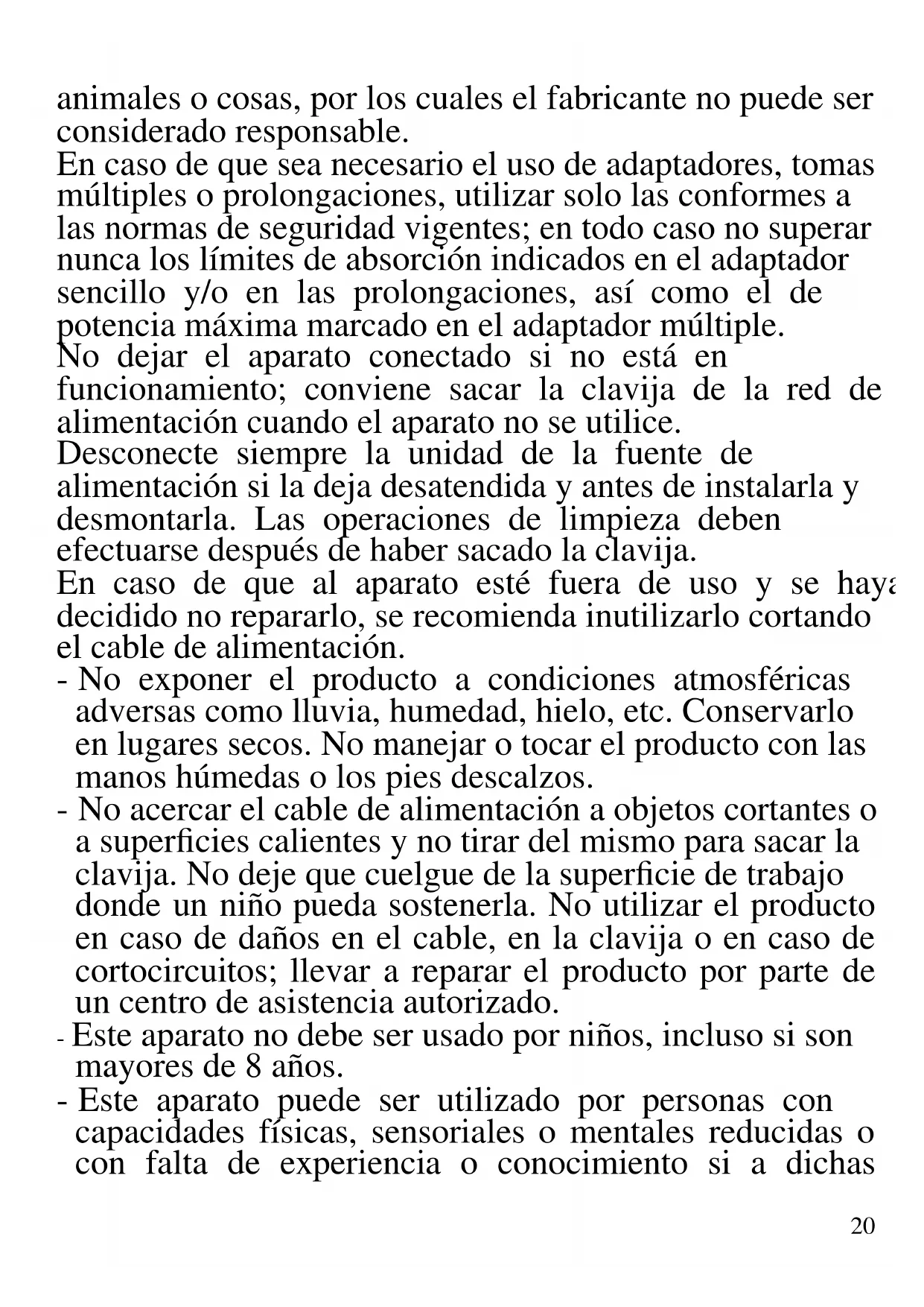 A continuación se presentan importantes indicaciones sobre la instalación, el uso y el mantenimiento. Conservar con cuidado este manual para cualquier consulta posterior; utilizar el producto solo de la manera que indica este manual de instrucciones; cualquier otro uso se considera inadecuado y peligroso; por ello el fabricante no puede ser considerado responsable en caso de que se produzcan daños derivados de usos inadecuados, erróneos o irracionales. Antes del uso asegurarse de la integridad del aparato; en caso de duda no utilizarlo y dirigirse al personal de asistencia; no dejar los elementos del embalaje (bolsas de plástico, poliestireno expandido, clavos, grapas, etc.) al alcance de los niños ya que son fuentes potenciales de peligro; además, cabe recordar que los citados elementos deben ser objeto de una recogida selectiva. Asegurarse de que los datos de la placa sean compatibles con los de la red eléctrica; la instalación se debe efectuar en función de las instrucciones del fabricante considerando la potencia del aparato indicada en la placa; una instalación errónea puede causar daños a personas,20 animales o cosas, por los cuales el fabricante no puede ser considerado responsable. En caso de que sea necesario el uso de adaptadores, tomas múltiples o prolongaciones, utilizar solo las conformes a las normas de seguridad vigentes; en todo caso no superar nunca los límites de absorción indicados en el adaptador sencillo y/o en las prolongaciones, así como el de potencia máxima marcado en el adaptador múltiple. No dejar el aparato conectado si no está en funcionamiento; conviene sacar la clavija de la red de alimentación cuando el aparato no se utilice. Desconecte siempre la unidad de la fuente de alimentación si la deja desatendida y antes de instalarla y desmontarla. Las operaciones de limpieza deben efectuarse después de haber sacado la clavija. En caso de que al aparato esté fuera de uso y se haya decidido no repararlo, se recomienda inutilizarlo cortando el cable de alimentación. - No exponer el producto a condiciones atmosféricas adversas como lluvia, humedad, hielo, etc. Conservarlo en lugares secos. No manejar o tocar el producto con las manos húmedas o los pies descalzos. - No acercar el cable de alimentación a objetos cortantes o a superficies calientes y no tirar del mismo para sacar la clavija. No deje que cuelgue de la superficie de trabajo donde un niño pueda sostenerla. No utilizar el producto en caso de daños en el cable, en la clavija o en caso de cortocircuitos; llevar a reparar el producto por parte de un centro de asistencia autorizado. - Este aparato no debe ser usado por niños, incluso si son mayores de 8 años. - Este aparato puede ser utilizado por personas con capacidades físicas, sensoriales o mentales reducidas o con falta de experiencia o conocimiento si a dichas21 personas se ha asegurado una supervisión o bien si han recibido instrucciones sobre el uso seguro del aparato. - Los niños no deben jugar con el aparato. - Mantener el producto y el cable fuera del alcance de los niños menores de 8 años. - No apto para uso comercial. Solo para uso doméstico En caso de avería y/o de funcionamiento anómalo no manipular el aparato. Para una posible reparación, dirigirse únicamente a un centro autorizado por el fabricante y solicitar el uso de recambios originales. El incumplimiento de lo indicado anteriormente puede comprometer la seguridad del aparato y anular las condiciones de la garantía. Antes de cada uso, desenrolle el cable de alimentación. Este aparato está diseñado para uso doméstico o similares: cocinas para el personal de tiendas, oficinas u otros centros de trabajo, para clientes de hoteles, moteles, hostales y similares. El aparato no está diseñado para su uso a través de temporizadores externos o mandos a distancia. Utilice únicamente piezas de repuesto y accesorios originales. No someta el producto a impactos fuertes se producirán daños serios. Mantenga la unidad lejos de materiales inflamables, calor, puntos fríos y vapor.
