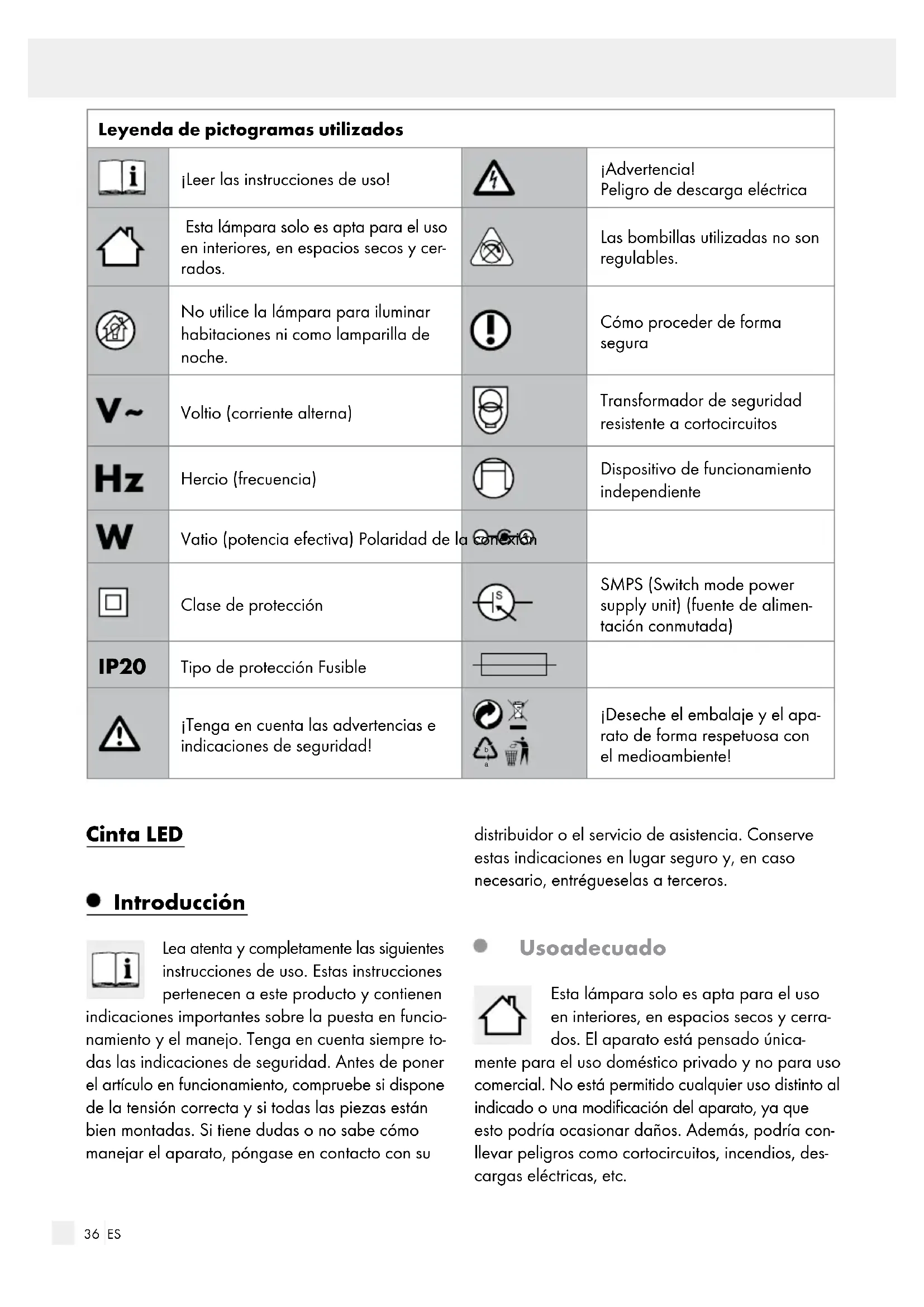 50 / 60 Hz 14109500L: máx. 7 W, 96 LED, longitud máx. 3 m 14109606L: máx. 9 W, 90 LED, longitud máx. 3m Clase de protección: II / Clase de aislamiento: IP20 Bombillas LED no intercambiables Seguridad Indicaciones de seguridad ¡El derecho de garantía quedará anulado en caso de producirse daños por no tener en cuenta estas instrucciones de uso! ¡No se asumirá responsabili- dad alguna por daños indirectos! En caso de que el manejo inadecuado del producto o el incumpli- miento de las indicaciones de seguridad provoquen daños materiales o personales, ¡no se asumirá nin- guna responsabilidad! Cómo evitar el peligro de muerte por descarga eléctrica Antes de cada uso compruebe que la cinta LED no esté dañada. Nunca utilice la cinta LED si encuentra cualquier tipo de desperfecto. Una conexión de red dañada puede incluso provocar la muerte por descarga eléctrica. En caso de daños, repara- ciones u otros problemas en el producto, dirí- jase al centro de servicio técnico o a un técnico electricista. El cable de red del aparato no puede reemplazarse. En caso de que el cable resulte dañado, deshágase del aparato. Este producto no contiene piezas que requieran mantenimiento por parte del usuario. Asegúrese antes de cada uso de que la tensión de red disponible coincida con la tensión de funcionamiento necesaria del artículo (consultar "Características técnicas"). Evite siempre el contacto de los elementos y contactos conductores con agua y demás líquidos. Nunca abra el equipo eléctrico ni introduzca objetos en el mismo. Esto puede suponer peligro de muerte por descarga eléctrica. No instale la lámpara en superficies húmedas o conductoras de la electricidad. No está permitido conectar eléctricamente la cinta de luz LED con otras cintas LED. Proteja el producto de bordes afilados, cargas mecánicas y superficies calientes. No la sujete con grapas o puntas cortantes.38 ES ... / Montar la ... / Mantenimiento y ... / Desecho del ... / Garantía y servicio ...Seguridad / Puesta en funcionamiento Antes de montar, desmontar o limpiar el pro- ducto, desconecte siempre el enchufe de la toma de corriente. No toque nunca el enchufe o la cinta de luz LED con las manos mojadas. Utilice exclusivamente los componentes sumi- nistrados; de lo contrario se elimina cualquier derecho de garantía. Este artículo no debe conectarse a la red eléc- trica mientras se encuentre dentro del envoltorio, a menos que este esté adaptado para la expo- sición del producto. Despliegue completamente el artículo antes de conectarlo a la red. Cómo prevenir incendios y lesiones Este artículo no contiene piezas que requieran mantenimiento por parte del usuario. Las bom- billas LED no son reemplazables. Si las bombillas LED llegan al final de su vida útil, deberá reemplazar el artículo completo. Las bombillas LED incluidas no son adecuadas para interruptores elec- trónicos ni reguladores. Cuando la luz esté encendida, no mirar al LED directamente a poca distancia. No observar el LED con un instrumento óptico (por ej. una lupa). Cómo proceder de forma segura No deje la cinta de luz LED ni el material en- voltorio sin supervisión. Podrían lesionarse o asfixiarse accidentalmente con el material de embalaje. Monte la cinta de luz LED de modo que esté protegida de la humedad, la suciedad y de temperaturas demasiado elevadas. ¡Proceda siempre con sumo cuidado! Preste mucha atención a lo que hace y actúe siempre con sentido común. Bajo ningún concepto uti- lice la cinta de luz LED si está distraído o no se encuentra bien. Familiarícese con la cinta de luz LED y con las indicaciones e ilustraciones de este manual an- tes de utilizarla. Para retirar la cinta de luz LED completamente de la corriente, es necesario sacar el adaptador del enchufe. Puesta en funcionamiento Retire todos los materiales del envoltorio antes del primer uso. La tira de LED no debe conectarse a la fuente de alimentación mientras se encuentre dentro del envoltorio. Acortar o unir la cinta de luz LED Tiene la posibilidad de separar la cinta de luz LED o de unirla a otra cinta.