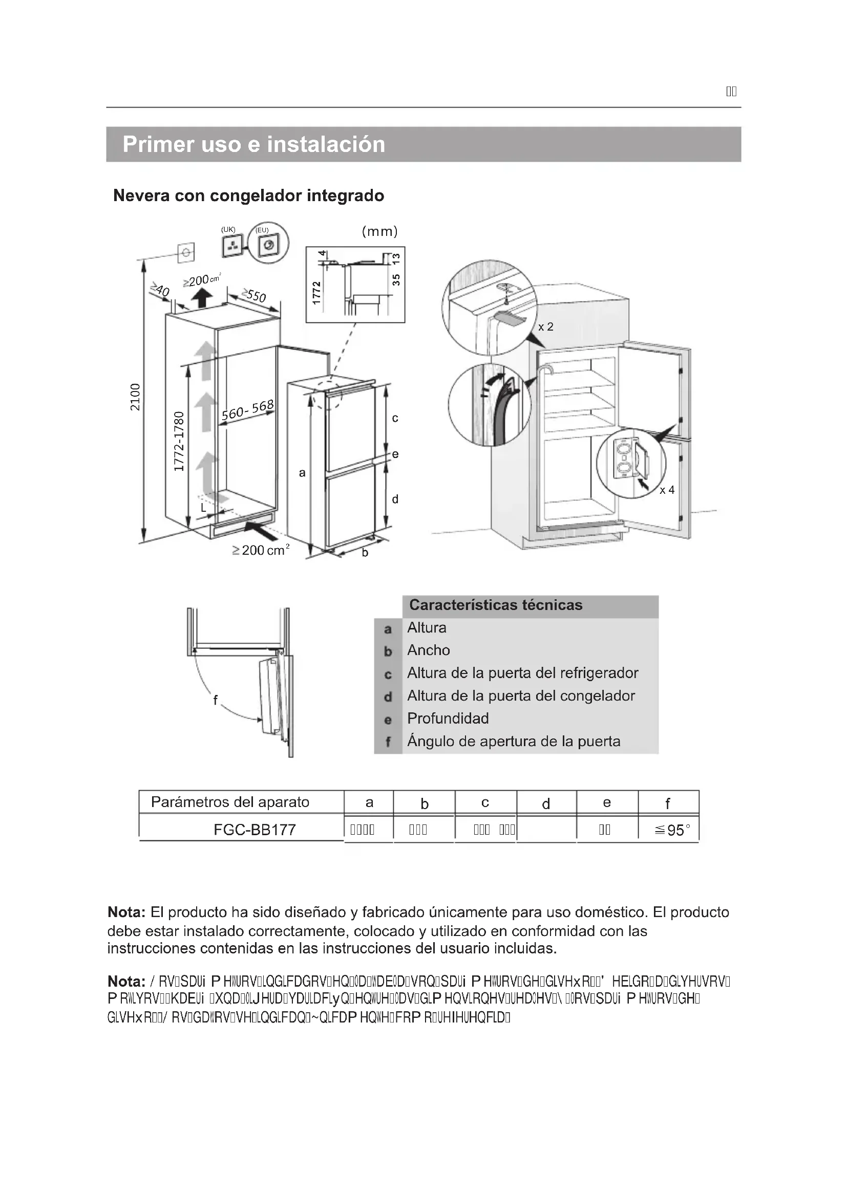 Primer uso e instalación Nevera con congelador integrado Nota: El producto ha sido diseñado y fabricado únicamente para uso doméstico. El producto debe estar instalado correctamente, colocado y utilizado en conformidad con las instrucciones contenidas en las instrucciones del usuario incluidas. x 4x 2 (UK)(EU)