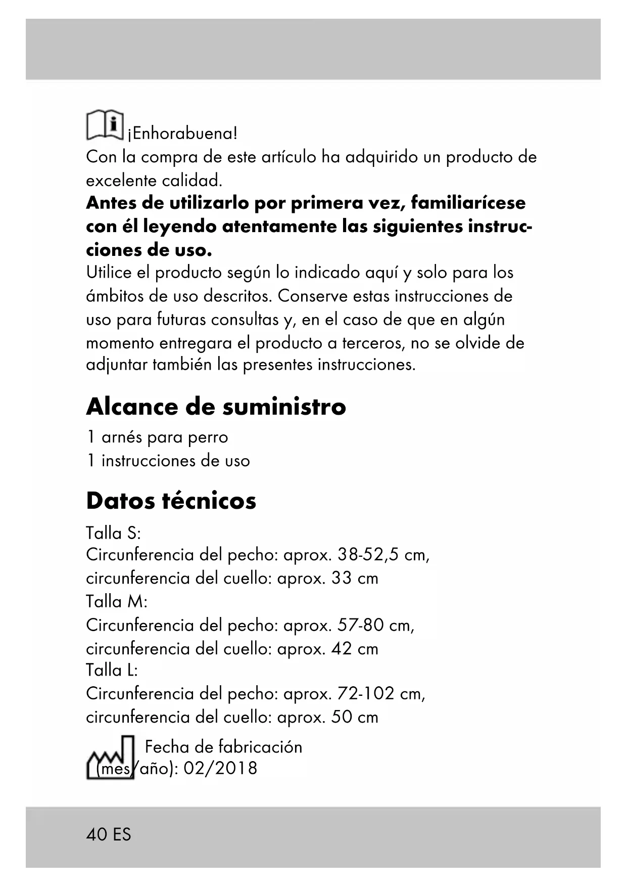 145ES Cuidado, almacenamiento El artículo se debe limpiar mecánicamente con regularidad por motivos de funcionalidad. ¡IMPORTANTE! Limpiar solamente con agua, nunca con productos de cuidado agresivos. Frotar a continuación con un paño seco. El artículo siempre se debe almacenar seco y limpio a temperatura ambiente y sin exponerlo a la radiación solar directa. En caso de enfermedad o después de ella, se debe desinfectar el artículo. Debe consultar a un veterinario de su confianza y preguntarle por desinfectantes y productos de higiene apropiados. Indicaciones para la eliminación Elimine el artículo y el material de embalaje conforme a la normativa legal local en la actualidad. No deje material de embalaje, como bolsas de plástico, en manos de niños. Guarde el material de embalaje en un lugar inaccesible para éstos. Indicaciones relativas a la garantía y la gestión de servicios Este producto se fabrica con gran esmero y bajo control continuo. Este producto tiene una garantía de tres años a partir de la fecha de compra. Por favor, guarde el tíquet de compra.46 ES La garantía solamente es válida para defectos de material o de fabricación y queda anulada en caso de tratamiento inapropiado o indebido. Sus derechos legales, especialmete el de régimen de garantía, no se ven restringidos por esta garantía. En caso de una eventual reclamación, póngase en contacto con el servicio de atención al cliente que le indicamos más abajo o envíenos un correo electrónico. Nuestros trabajado- res le informarán con la mayor rapidez posible sobre cómo proceder. En todos los casos le ofrecemos una atención personalizada. El periodo de garantía no se verá prolongado por reparaci- ones en garantía, garantía legal o como servicio de la casa. Esto es válido también para las piezas reemplazadas o reparadas. Las reparaciones realizadas una vez transcurrido el periodo de garantía se deberán pagar. IAN: 296828 Servicio España Tel.: 902 59 99 22 (0,08 EUR/Min. + 0,11 EUR/llamada (tarifa normal)) (0,05 EUR/Min. + 0,11 EUR/llamada (tarifa reducida)) E-Mail: deltasport@lidl.es47PT Muitos Parabéns! Com a sua compra optou por um produto de alta qualidade. Antes de o utilizar pela primeira vez, familiarize-se o com o produto. Para o efeito leia com atenção o seguinte manual de instruções. Utilize o produto apenas conforme descrito e para as apli- cações indicadas. Guarda estas instruções em lugar seguro. No caso de transferir o produto para terceiros, faço-a acom- panhar de todos os documentos. Volume de fornecimento 1 peitoral 1 arnês para cão Dados técnicos Tamanho S: Perímetro do peito: aprox. 38-52,5 cm, Perímetro do pescoço: aprox. 33 cm Tamanho M: Perímetro do peito: aprox. 57-80 cm, Perímetro do pescoço: aprox. 42 cm Tamanho L: Perímetro do peito: aprox. 72-102 cm, Perímetro do pescoço: aprox. 50 cm Data de fabrico (mês/ano): 02/201848 PT Utilização prevista Este artigo foi concebido como peitoral para cães com um perímetro de peito de aprox. 38-52,5 cm e um perímetro de pescoço de aprox. 33 cm para o tamanho S, com aprox. 57-80 cm de perímetro de peito e aprox. 42 cm de períme- tro de pescoço para o tamanho M e com aprox. 72-102 cm de perímetro de peito e aprox. 50 cm de perímetro de pescoço para o tamanho L e destina-se a utilização privada. Utilize o peitoral apenas quando levar o cão pela trela. O artigo não deve ser utilizado em estado estacionário. Instruções de segurança Perigo de ferimentos!