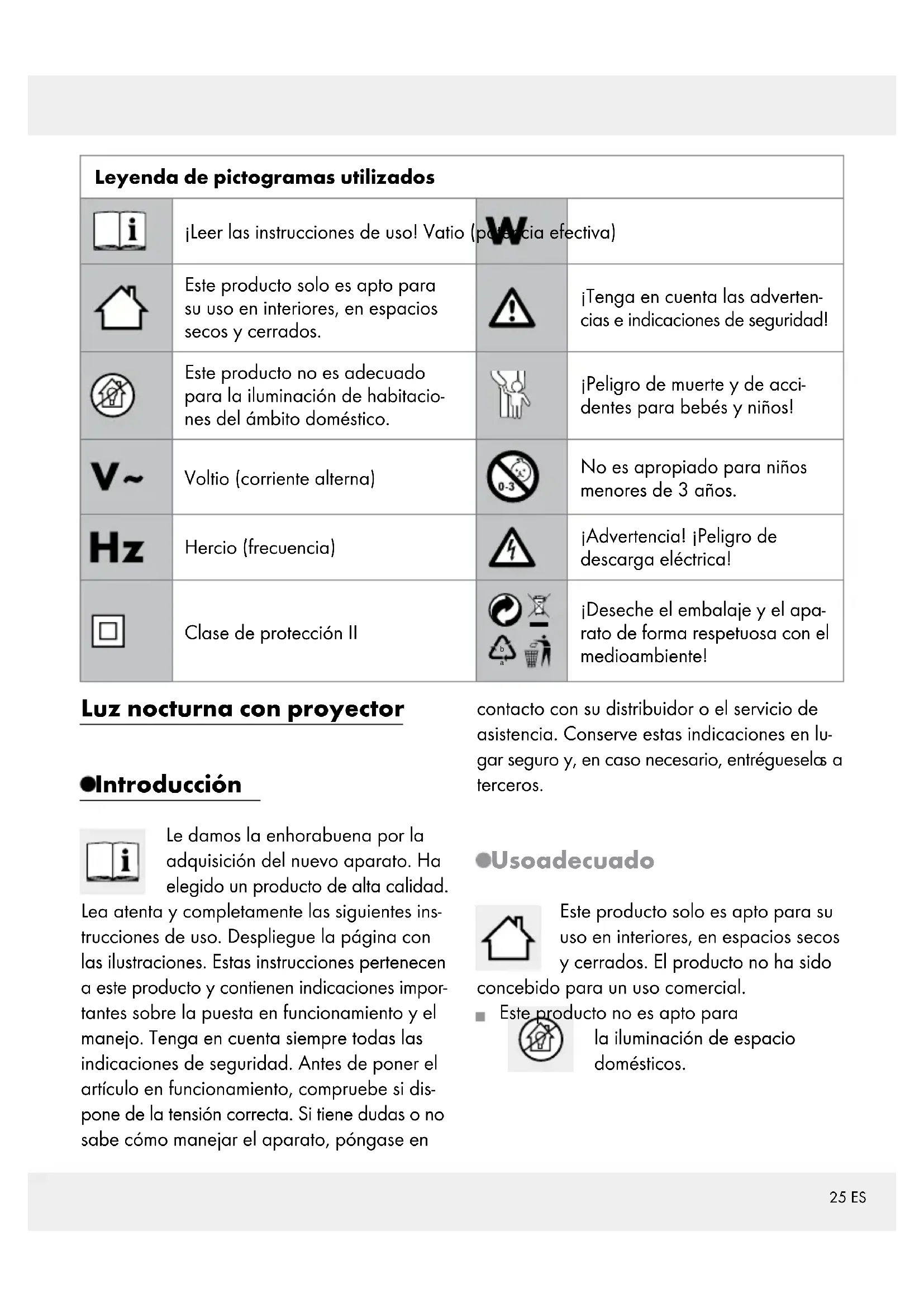 ¡Deseche el embalaje y el apa- rato de forma respetuosa con el medioambiente! Luz nocturna con proyector Introducción Le damos la enhorabuena por la adquisición del nuevo aparato. Ha elegido un producto de alta calidad. Lea atenta y completamente las siguientes ins- trucciones de uso. Despliegue la página con las ilustraciones. Estas instrucciones pertenecen a este producto y contienen indicaciones impor- tantes sobre la puesta en funcionamiento y el manejo. Tenga en cuenta siempre todas las indicaciones de seguridad. Antes de poner el artículo en funcionamiento, compruebe si dis- pone de la tensión correcta. Si tiene dudas o no sabe cómo manejar el aparato, póngase en contacto con su distribuidor o el servicio de asistencia. Conserve estas indicaciones en lu- gar seguro y, en caso necesario, entréguesela s a terceros. Uso adecuado Este producto solo es apto para su uso en interiores, en espacios secos y cerrados. El producto no ha sido concebido para un uso comercial. Este producto no es apto para la iluminación de espacio domésticos.26 ES Descripción de las piezas