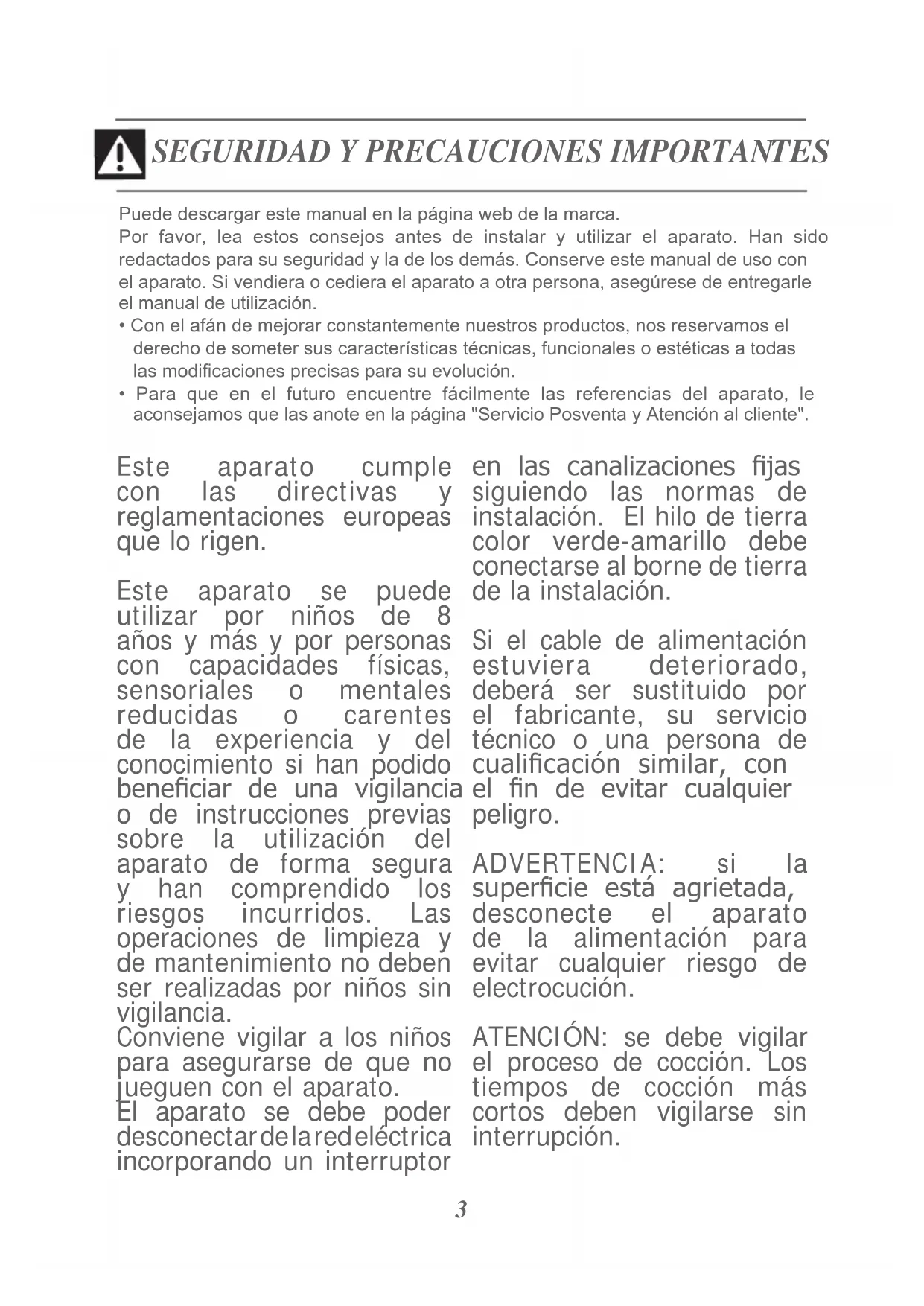 - Para que en el futuro encuentre fácilmente las referencias del aparato, le aconsejamos que las anote en la página "Servicio Posventa y Atención al cliente". Este aparato cumple con las directivas y reglamentaciones europeas que lo rigen. Este aparato se puede utilizar por niños de 8 años y más y por personas con capacidades físicas, sensoriales o mentales reducidas o carentes de la experiencia y del conocimiento si han podido beneciar de una vigilancia o de instrucciones previas sobre la utilización del aparato de forma segura y han comprendido los riesgos incurridos. Las operaciones de limpieza y de mantenimiento no deben ser realizadas por niños sin vigilancia. Conviene vigilar a los niños para asegurarse de que no jueguen con el aparato. El aparato se debe poder desconectar de la red eléctrica incorporando un interruptor en las canalizaciones jas siguiendo las normas de instalación. El hilo de tierra color verde-amarillo debe conectarse al borne de tierra de la instalación. Si el cable de alimentación estuviera deteriorado, deberá ser sustituido por el fabricante, su servicio técnico o una persona de cualicación similar, con el n de evitar cualquier peligro. ADVERTENCIA: si la supercie está agrietada, desconecte el aparato de la alimentación para evitar cualquier riesgo de electrocución. ATENCIÓN: se debe vigilar el proceso de cocción. Los tiempos de cocción más cortos deben vigilarse sin interrupción.4 No utilice un aparato de limpieza a vapor. Se recomienda no depositar objetos metálicos como cuchillos, tenedores, cucharas y tapas sobre el plano de cocción, ya que pueden volverse calientes. Después del uso, pare la placa desde el teclado de control sin tener en cuenta el detector de cacerolas. El aparato no está diseñado para funcionar con un temporizador externo ni un sistema de mando a distancia separado. Este aparato está diseñado para instalarse únicamente en una encimera. ADVERTENCIA: cocinar sin vigilancia sobre una placa de cocción con grasa o aceite puede ser peligroso y puede causar un incendio. No intente nunca apagar un fuego con agua sino apagar el aparato, y luego cubrir la llama con una tapa o una cubierta resistente al fuego. ADVERTENCIA: riesgo de incendio: no almacene nada sobre las supercies de cocción. No recomendamos dispositivos de protección de placa. El uso de tapas inapropiadas puede provocar accidentes. El aparato y sus partes accesibles se calientan durante el uso. Mantenga alejados a los niños menores de 8 años o vigílelos permanentemente.