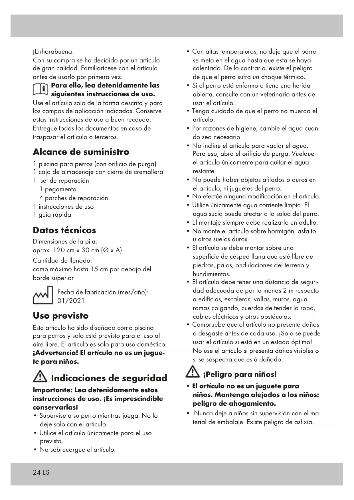 antes de llene de nuevo. Almacenamiento, limpieza ¡Cambie el agua del artículo con frecuencia, especialmente si hace calor o si está sucia! Si no va a utilizarlo, almacene siempre el artículo seco y limpio y a temperatura ambiente. Pliegue e introduzca el artículo en la bolsa de alma- cenamiento únicamente cuando esté comple- tamente seco. El orificio de purga debe estar siempre cerrado en el almacenamiento. Limpiar solamente con agua o agua jabonosa suave, nunca con detergentes agresivos. Al almace- narlo durante el invierno, no se pueden colocar objetos afilados encima del artículo ni se puede empolvar con polvos de talco. Indicaciones para la eliminación Elimine el artículo y el material de embalaje conforme a la normativa legal local en la ac- tualidad. No deje material de embalaje, como bolsas de plástico, en manos de niños. Guarde el material de embalaje en un lugar inaccesible para éstos. Deseche los productos y embalajes de manera respetuosa con el medio ambiente. El código de reciclaje sirve para identificar diversos materiales para reincorporarlos en el ciclo de reciclaje. El código consta del símbolo de reciclaje, el cual debe reflejar el ciclo de recuperación, y de un número que identifica el material. ES26 ES Indicaciones relativas a la garantía y la gestión de servicios Este producto se fabrica con gran esmero y bajo control continuo. Este producto tiene una garantía de tres años a partir de la fecha de compra. Por favor, guarde el tíquet de compra. La garantía solamente es válida para defectos de material o de fabricación y queda anulada en caso de tratamiento inapropiado o indebi- do. Sus derechos legales, especialmete el de régimen de garantía, no se ven restringidos por esta garantía. En caso de una eventual reclamación, pónga- se en contacto con el servicio de atención al cliente que le indicamos más abajo o envíenos un correo electrónico. Nuestros trabajadores le informarán con la mayor rapidez posible sobre cómo proceder. En todos los casos le ofrecemos una atención personalizada. El periodo de garantía no se verá prolongado por reparaciones en garantía, garantía legal o como servicio de la casa. Esto es válido también para las piezas reemplazadas o reparadas. Las reparaciones realizadas una vez transcurrido el periodo de garantía se deberán pagar. IAN: 353143_2007 Servicio España Tel.: 902 59 99 22 (0,08 EUR/Min. + 0,11 EUR/ llamada (tarifa normal)) (0,05 EUR/Min. + 0,11 EUR/ llamada (tarifa reducida)) E-Mail: deltasport@lidl.es27 Hjertelig tillykke! Du har valgt at købe et kvalitetsprodukt. Lær pro- duktet at kende, inden du bruger det første gang. Det gør du ved at læse nedenståen- de brugervejledning omhyggeligt. Brug kun produktet som beskrevet og til de angivne anvendelsesområder. Opbevar denne brugervejledning et sikkert sted. Udlever også alle dokumenter, hvis produktet videregives til en tredjepart. Leveringsomfang 1 x soppebassin til hunde (med afløbsåbning) 1 x opbevaringstaske med velcrolukning 1 x reparationssæt 1 x lim 4 x reparationslap 1 x brugervejledning 1 x kort vejledning Tekniske data Mål bassin: ca. 120 cm x 30 cm (Ø x H) Indhold: maks. til 15 cm under øverste kant Fremstillingsdato (måned/år): 01/2021 Bestemmelsesmæssig brug Dette produkt er beregnet til brug som bassin til hunde og kun til udendørs brug. Produktet er kun til privat brug. Advarsel! Produktet er ikke legetøj! Sikkerhedsanvisninger Vigtigt: Læs denne brugervejledning omhyggeligt, og opbevar den til senere brug!