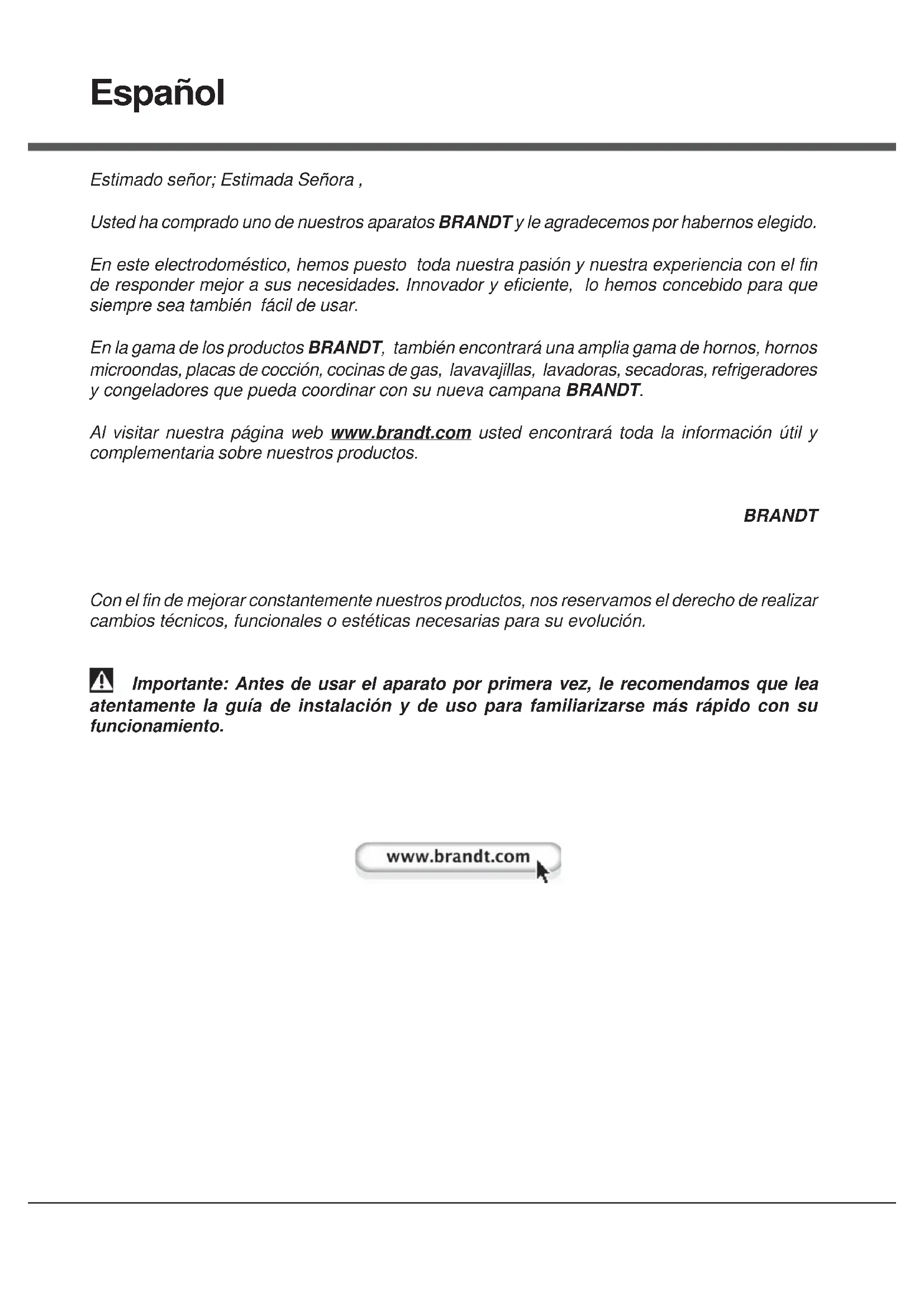 PEspañol Estimado señor; Estimada Señora , Usted ha comprado uno de nuestros aparatos BRANDT y le agradecemos por habernos elegido. En este electrodoméstico, hemos puesto toda nuestra pasión y nuestra experiencia con el fin de responder mejor a sus necesidades. Innovador y eficiente, lo hemos concebido para que siempre sea también fácil de usar. En la gama de los productos BRANDT, también encontrará una amplia gama de hornos, hornos microondas, placas de cocción, cocinas de gas, lavavajillas, lavadoras, secadoras, refrigeradores y congeladores que pueda coordinar con su nueva campana BRANDT. Al visitar nuestra página web www.brandt.com usted encontrará toda la información útil y complementaria sobre nuestros productos. BRANDT Con el fin de mejorar constantemente nuestros productos, nos reservamos el derecho de realizar cambios técnicos, funcionales o estéticas necesarias para su evolución. Importante: Antes de usar el aparato por primera vez, le recomendamos que lea atentamente la guía de instalación y de uso para familiarizarse más rápido con su funcionamiento.SEGURIDAD Y PRECAUCIONES IMPORTANTES Este manual también está disponible en el sitio Internet de la marca. Por favor lea estos consejos antes de instalar y utilizar su aparato. Han sido redactados para su seguridad y la de los demás. Conserve este manual de utilización con su aparato. Si el aparato tuviera que venderse o cederse a otrapersona, cerciórese de que el manual de utilización lo acompañe.