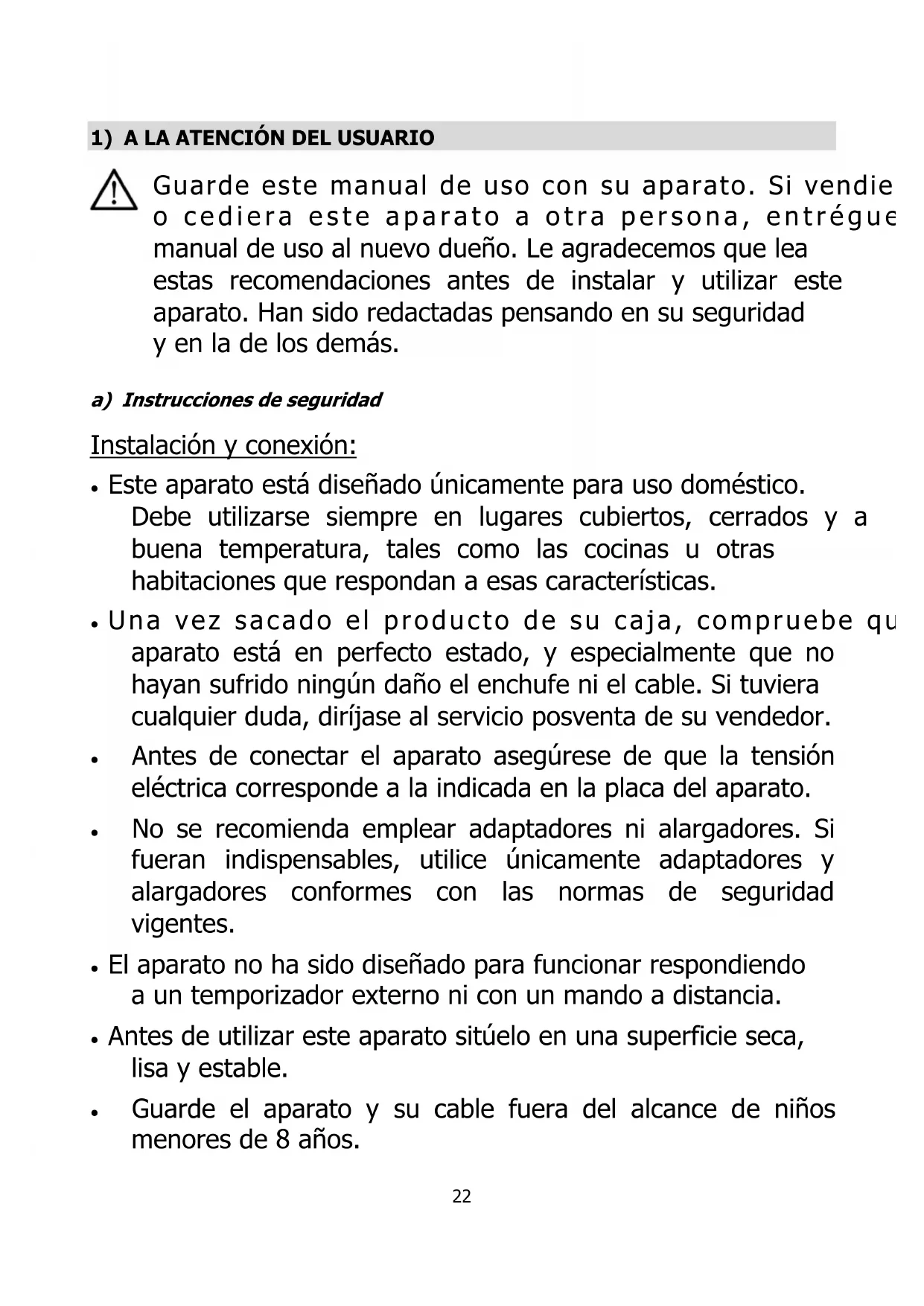 None of the components is suitable for washing in the dishwasher. Do not use a scourer on the metal and plastic parts19 b) Storing the Machine After cleaning the parts dry them with a clean cloth. Assemble the parts and keep the machine in a dry place. Clean all the parts after each use. BRANDT FRANCE - Simplified Joint Stock Company with capital of 1,000,000 Euros 89/91 Boulevard Franklin Roosevelt - 92854 Rueil-Malmaison (France)20 Estimada Clienta, estimado Cliente: Acaba usted de adquirir un producto BRANDT, y le agradecemos la confianza que ha depositado en nosotros. Hemos diseñado y fabricado este producto pensando en Usted, en su modo de vida, en sus necesidades, para satisfacer lo mejor posible sus expectativas. Hemos puesto en él nuestros conocimientos, nuestro espíritu innovador y toda la pasión que nos mueve desde hace más de 60 años. En nuestro deseo permanente de satisfacer cada vez mejor sus exigencias, nuestro servicio de atención al consumidor está a su disposición, para escucharle y responder a todas sus dudas o sugerencias. También puede entrar en nuestro sitio web www.brandt.com, donde encontrará nuestras innovaciones más recientes, además de útil información complementaria. A BRANDT le encanta acompañarle en su día a día y le desea que disfrute plenamente de su compra. Importante: Antes de poner en marcha el aparato, lea atentamente este manual de instalación y de uso para familiarizarse más rápidamente con su funcionamiento.21 ÍNDICE