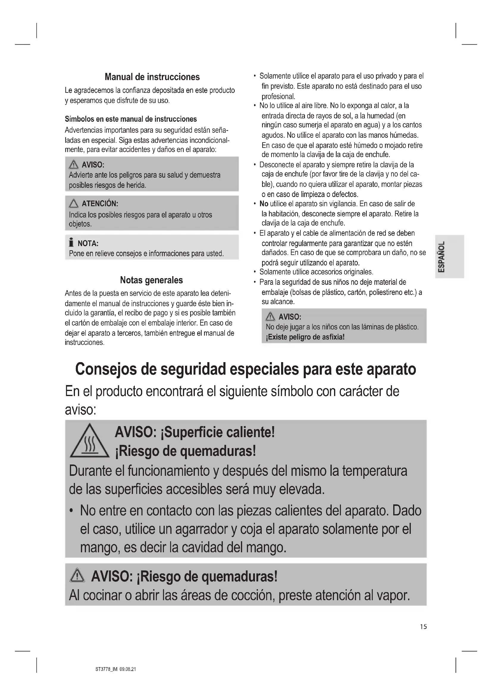 - No entre en contacto con las piezas calientes del aparato. Dado el caso, utilice un agarrador y coja el aparato solamente por el mango, es decir la cavidad del mango. AVISO: ¡Riesgo de quemaduras! Al cocinar o abrir las áreas de cocción, preste atención al vapor.ST3778_IM 09.08.21
