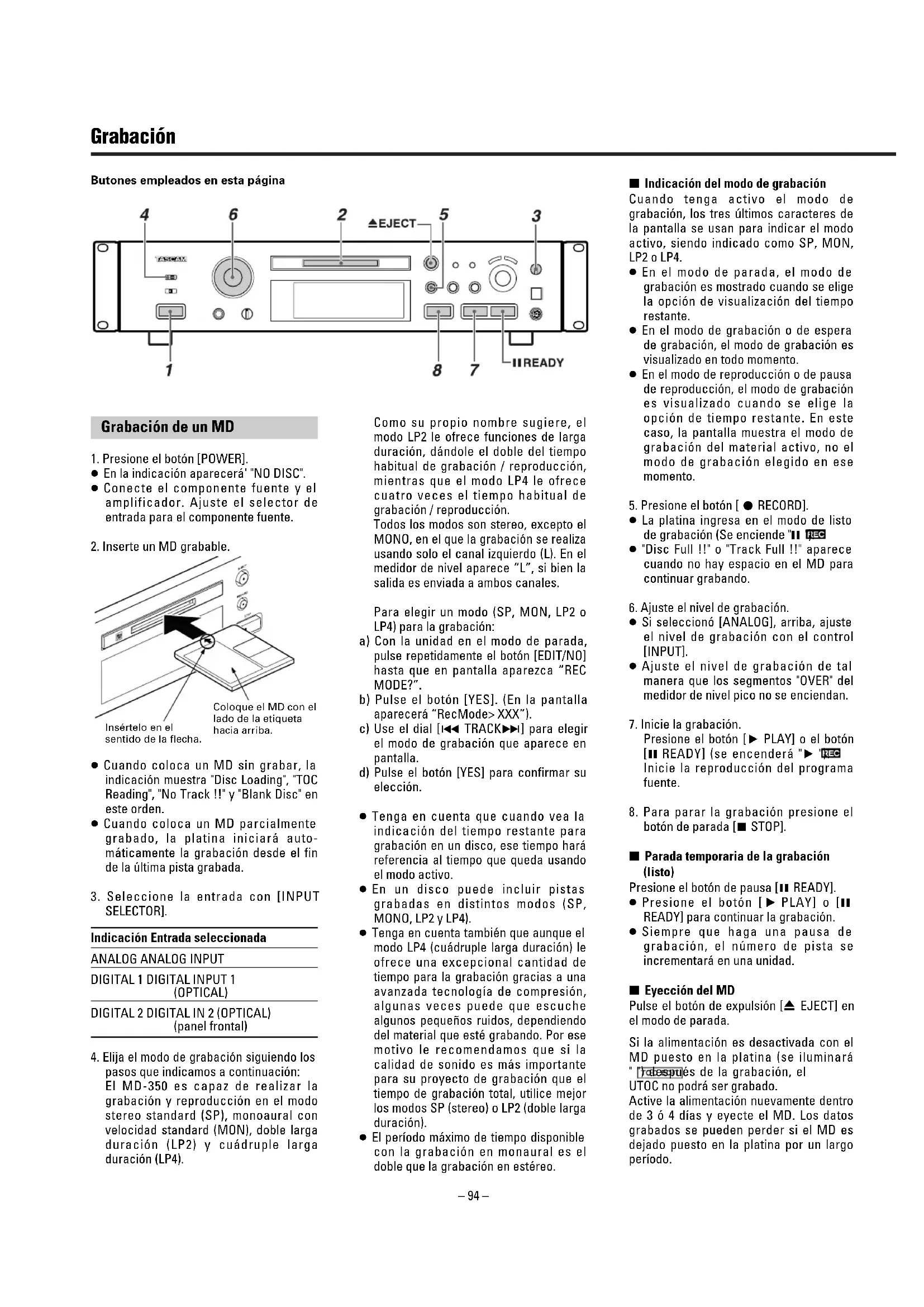 botón de parada [ ª STOP]. ª Parada temporaria de la grabación (listo) Presione el botón de pausa [ π READY]. … Presione el botón [ ¥ PLAY] o [π READY] para continuar la grabación. … Siempre que haga una pausa de grabación, el número de pista se incrementará en una unidad. ª Eyección del MD Pulse el botón de expulsión [ø EJECT] en el modo de parada. Si la alimentación es desactivada con el MD puesto en la platina (se iluminará " ") después de la grabación, el UTOC no podrá ser grabado. Active la alimentación nuevamente dentro de 3 ó 4 días y eyecte el MD. Los datos grabados se pueden perder si el MD es dejado puesto en la platina por un largo período.Notas sobre grabación ª Para proteger un MD contra borrado accidental … Después de grabar el MD, deslice la lengüeta de protección contra grabación para que el orificio quede abierto. … Para grabar el MD otra vez, deslice la lengüeta para cerrar el orificio. ª Cuando aparece el mensaje "Disc Full !!" o "Track Full !!" El MD no tiene más espacio disponible para grabar o todas las pistas del MD han sido utilizadas. Borre las pistas que no necesite o grabe la música en otro MD. – 95 – ESPAÑOL ª La forma de asignación de los números de pista varía dependiendo de la fuente. Cuando se reproduce un CD o un MD, y se lo graba digitalmente seleccionado [DIGITAL 1] o [DIGITAL 2] con el selector [INPUT SELECTOR]: … Los números de pista en el MD grabado son asignados para adecuarse a los del CD o MD fuente. Sin embargo, en los casos abajo listados sólo un número de pista puede ser asignado a una sección grabada.
