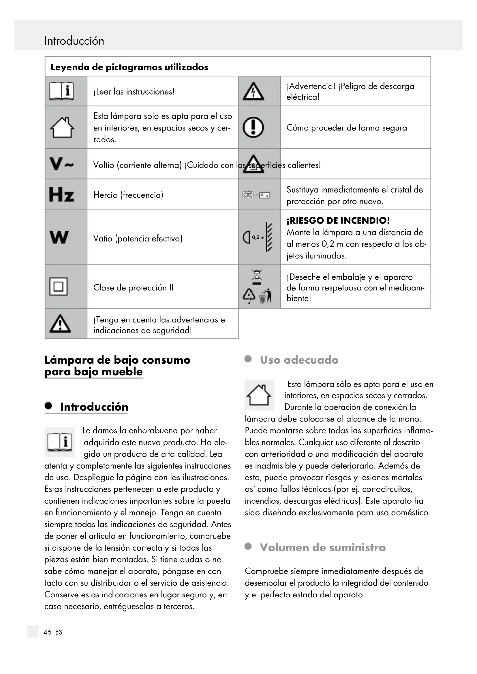 ¡Deseche el embalaje y el aparato de forma respetuosa con el medioam- biente! ¡Tenga en cuenta las advertencias e indicaciones de seguridad! Lámpara de bajo consumo para bajo mueble Introducción Le damos la enhorabuena por haber adquirido este nuevo producto. Ha ele- gido un producto de alta calidad. Lea atenta y completamente las siguientes instrucciones de uso. Despliegue la página con las ilustraciones. Estas instrucciones pertenecen a este producto y contienen indicaciones importantes sobre la puesta en funcionamiento y el manejo. Tenga en cuenta siempre todas las indicaciones de seguridad. Antes de poner el artículo en funcionamiento, compruebe si dispone de la tensión correcta y si todas las piezas están bien montadas. Si tiene dudas o no sabe cómo manejar el aparato, póngase en con- tacto con su distribuidor o el servicio de asistencia. Conserve estas indicaciones en lugar seguro y, en caso necesario, entrégueselas a terceros. Uso adecuado Esta lámpara sólo es apta para el uso en interiores, en espacios secos y cerrados. Durante la operación de conexión la lámpara debe colocarse al alcance de la mano. Puede montarse sobre todas las superficies inflama- bles normales. Cualquier uso diferente al descrito con anterioridad o una modificación del aparato es inadmisible y puede deteriorarlo. Además de esto, puede provocar riesgos y lesiones mortales así como fallos técnicos (por ej. cortocircuitos, incendios, descargas eléctricas). Este aparato ha sido diseñado exclusivamente para uso doméstico. Volumen de suministro Compruebe siempre inmediatamente después de desembalar el producto la integridad del contenido y el perfecto estado del aparato.47 ES Introducción / Seguridad 1 lámpara de bajo consumo para encimera, modelo 14102104L y 14102106L 1 tubo fluorescente T 5, 13 W 1 cable de alimentación 1 cable de conexión 2 tacos 2 tornillos 1 manual de instrucciones Descripción de las piezas