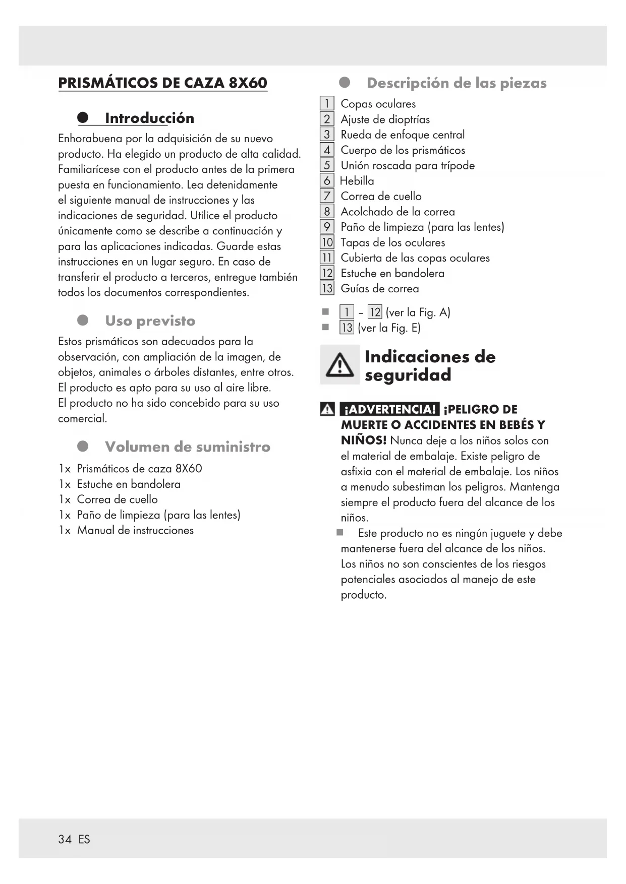 Introducción Enhorabuena por la adquisición de su nuevo producto. Ha elegido un producto de alta calidad. Familiarícese con el producto antes de la primera puesta en funcionamiento. Lea detenidamente el siguiente manual de instrucciones y las indicaciones de seguridad. Utilice el producto únicamente como se describe a continuación y para las aplicaciones indicadas. Guarde estas instrucciones en un lugar seguro. En caso de transferir el producto a terceros, entregue también todos los documentos correspondientes. Uso previsto Estos prismáticos son adecuados para la observación, con ampliación de la imagen, de objetos, animales o árboles distantes, entre otros. El producto es apto para su uso al aire libre. El producto no ha sido concebido para su uso comercial. Volumen de suministro 1x Prismáticos de caza 8X60 1x Estuche en bandolera 1x Correa de cuello 1x Paño de limpieza (para las lentes) 1x Manual de instrucciones Descripción de las piezas [1] Copas oculares [2] Ajuste de dioptrías [3] Rueda de enfoque central [4] Cuerpo de los prismáticos [5] Unión roscada para trípode [6] Hebilla [7] Correa de cuello [8] Acolchado de la correa [9] Paño de limpieza (para las lentes) [] Tapas de los oculares [] Cubierta de las copas oculares [] Estuche en bandolera [] Guías de correa [1] –[] (ver la Fig. A) [] (ver la Fig. E) Indicaciones de seguridad