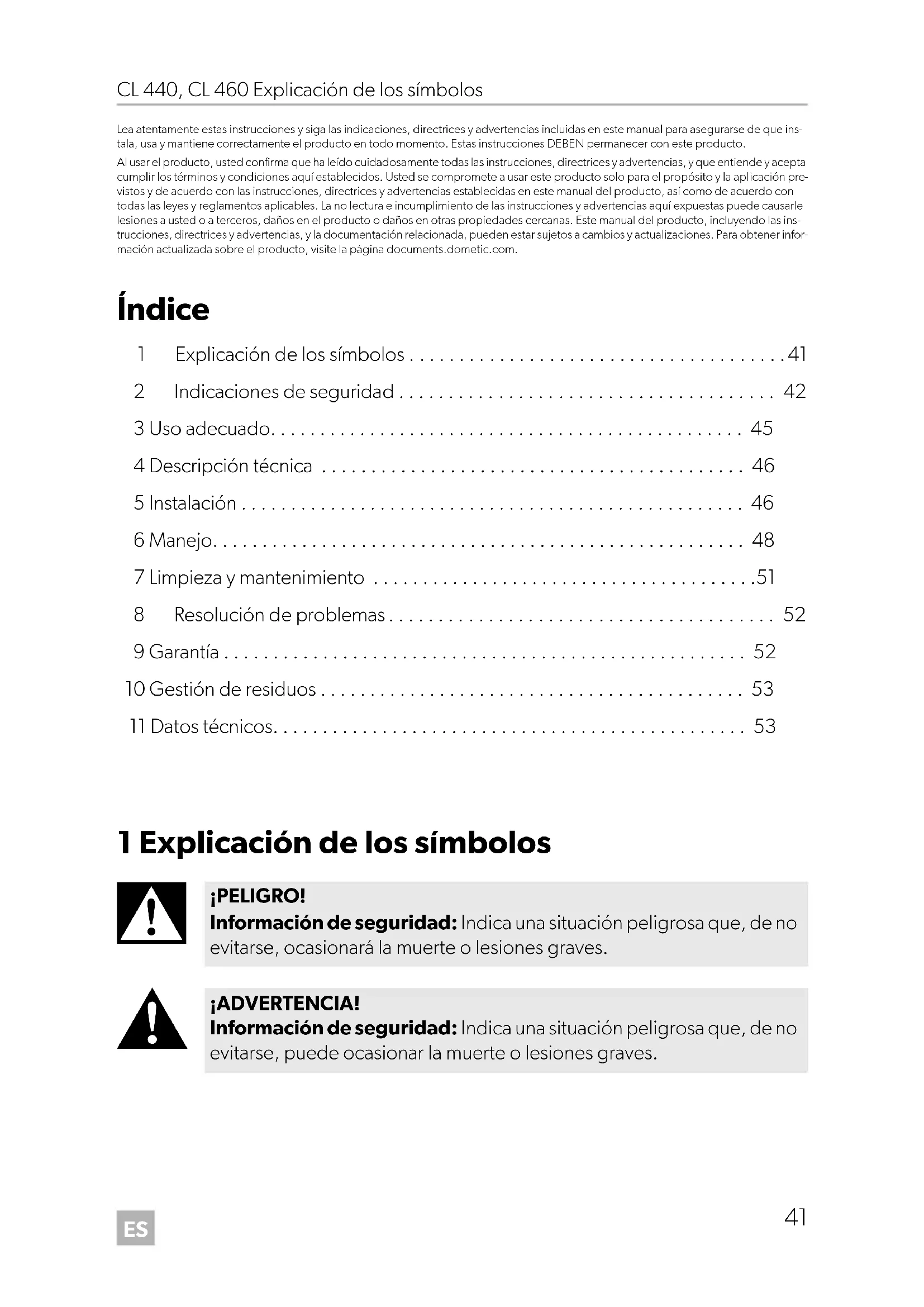 - Lea atentamente estas instrucciones y siga las indicaciones, directrices y advertencias incluidas en este manual para asegurarse de que ins- tala, usa y mantiene correctamente el producto en todo momento. Estas instrucciones DEBEN permanecer con este producto. Al usar el producto, usted confirma que ha leído cuidadosamente todas las instrucciones, directrices y advertencias, y que entiende y acepta cumplir los términos y condiciones aquí establecidos. Usted se compromete a usar este producto solo para el propósito y la aplicación pre- vistos y de acuerdo con las instrucciones, directrices y advertencias establecidas en este manual del producto, así como de acuerdo con todas las leyes y reglamentos aplicables. La no lectura e incumplimiento de las instrucciones y advertencias aquí expuestas puede causarle lesiones a usted o a terceros, daños en el producto o daños en otras propiedades cercanas. Este manual del producto, incluyendo las ins- trucciones, directrices y advertencias, y la documentación relacionada, pueden estar sujetos a cambios y actualizaciones. Para obtener infor- mación actualizada sobre el producto, visite la página documents.dometic.com. Índice 1 Explicación de los símbolos p. 41