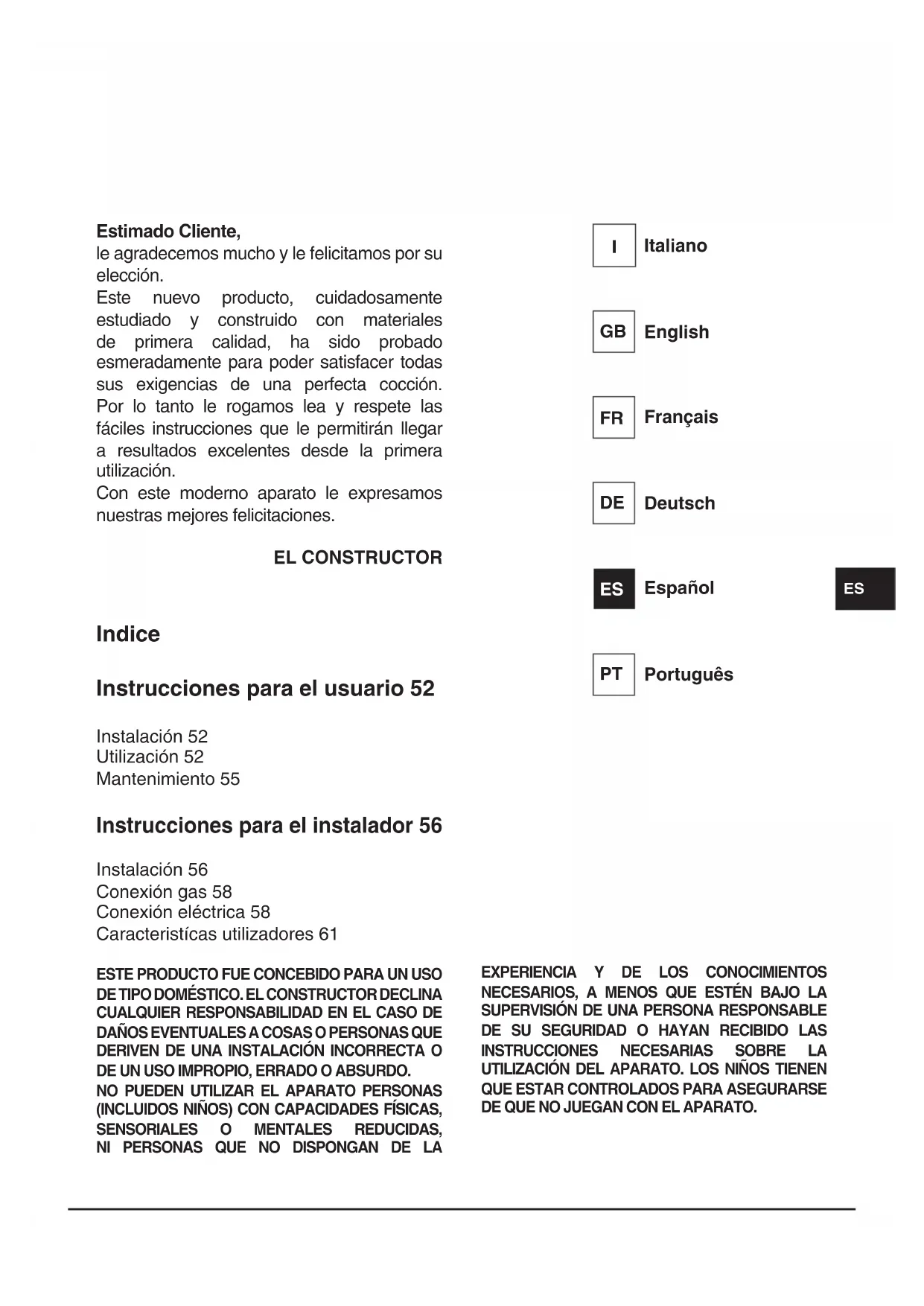 Este nuevo producto, cuidadosamente estudiado y construido con materiales de primera calidad, ha sido probado esmeradamente para poder satisfacer todas sus exigencias de una perfecta cocción. Por lo tanto le rogamos lea y respete las fáciles instrucciones que le permitiránURTAR研究成果 excellentes desdela primerautilizacion.