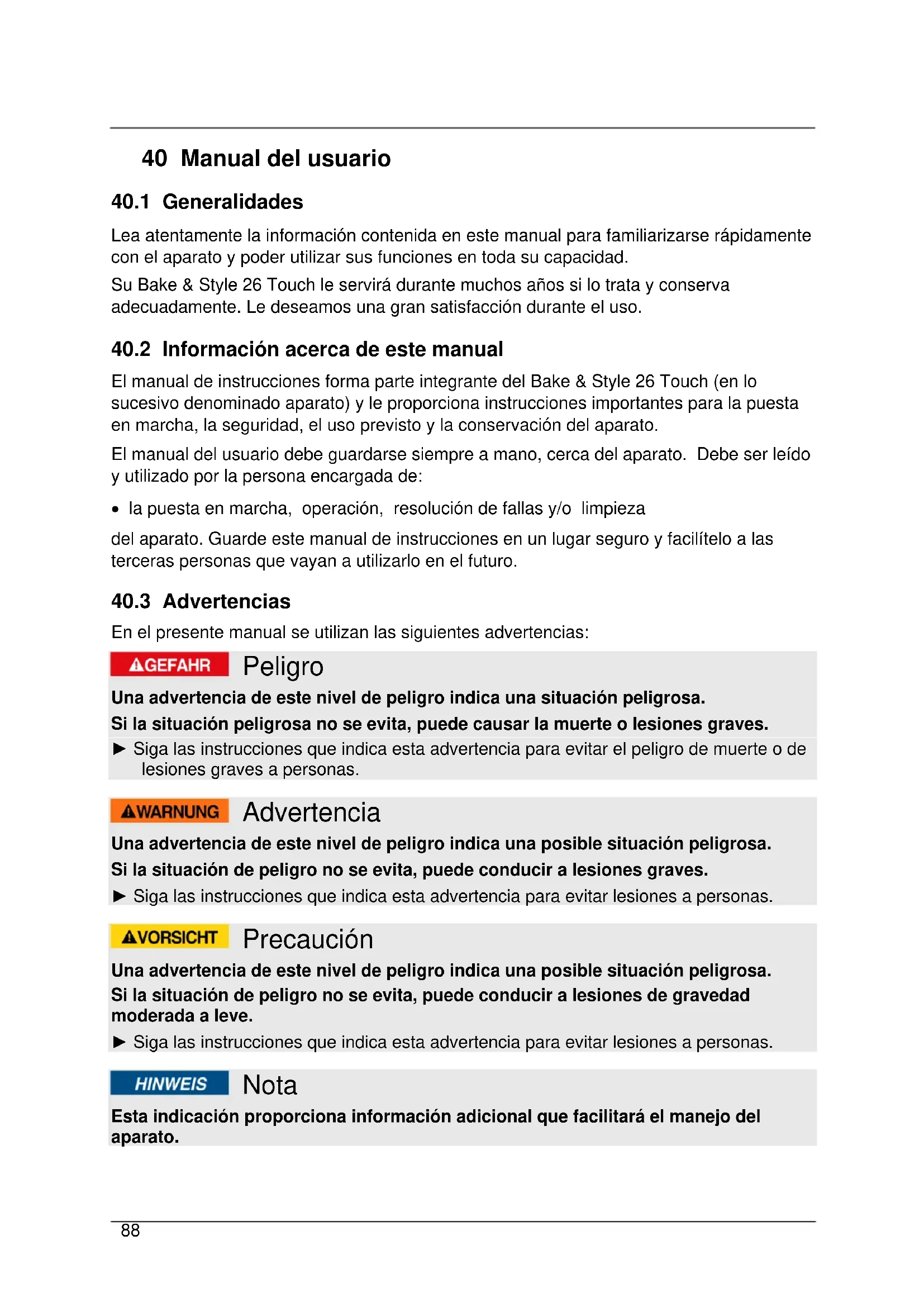 El manual de instrucciones forma parte integrante del Bake & Style 26 Touch (en lo sucesivo denominado aparato) y le proporciona instrucciones importantes para la puesta en marcha, la seguridad, el uso previsto y la conservación del aparato. El manual del usuario debe guardarse siempre a mano, cerca del aparato. Debe ser leído y utilizado por la persona encargada de: