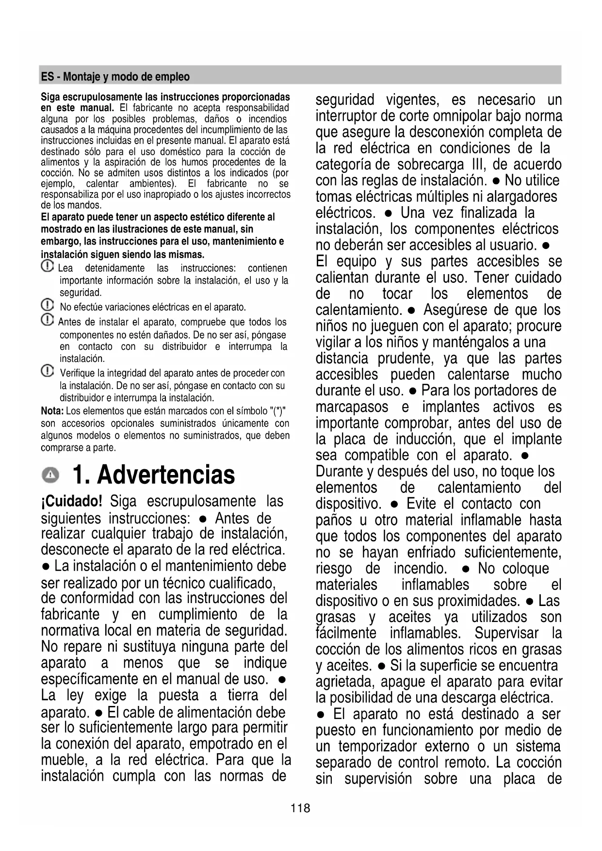 Als de storing na het uitvoeren van deze controles nog steeds aanwezig is, neem dan contact op met de dichtstbijzijnde Servicedienst.118 ES - Montaje y modo de empleo Siga escrupulosamente las instrucciones proporcionadas en este manual. El fabricante no acepta responsabilidad alguna por los posibles problemas, daños o incendios causados a la máquina procedentes del incumplimiento de las instrucciones incluidas en el presente manual. El aparato está destinado sólo para el uso doméstico para la cocción de alimentos y la aspiración de los humos procedentes de la cocción. No se admiten usos distintos a los indicados (por ejemplo, calentar ambientes). El fabricante no se responsabiliza por el uso inapropiado o los ajustes incorrectos de los mandos. El aparato puede tener un aspecto estético diferente al mostrado en las ilustraciones de este manual, sin embargo, las instrucciones para el uso, mantenimiento e instalación siguen siendo las mismas. Lea detenidamente las instrucciones: contienen importante información sobre la instalación, el uso y la seguridad. No efectúe variaciones eléctricas en el aparato. Antes de instalar el aparato, compruebe que todos los componentes no estén dañados. De no ser así, póngase en contacto con su distribuidor e interrumpa la instalación. Verifique la integridad del aparato antes de proceder con la instalación. De no ser así, póngase en contacto con su distribuidor e interrumpa la instalación. Nota: Los elementos que están marcados con el símbolo "(*)" son accesorios opcionales suministrados únicamente con algunos modelos o elementos no suministrados, que deben comprarse a parte.