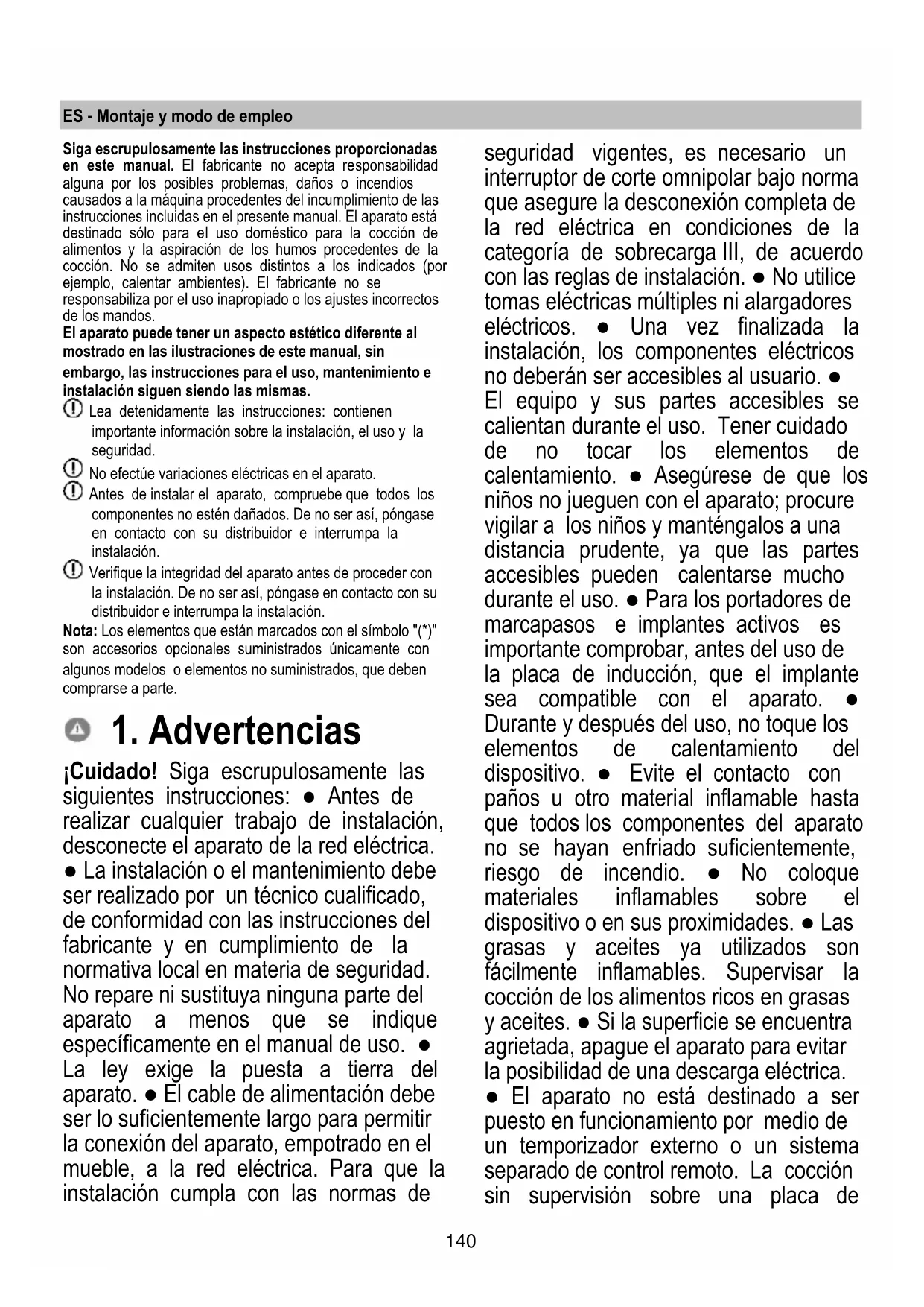 Als de storing na het uitvoeren van deze controles nog steeds aanwezig is, neem dan contact op met de dichtstbijzijnde Servicedienst.140 ES - Montaje y modo de empleo Siga escrupulosamente las instrucciones proporcionadas en este manual. El fabricante no acepta responsabilidad alguna por los posibles problemas, daños o incendios causados a la máquina procedentes del incumplimiento de las instrucciones incluidas en el presente manual. El aparato está destinado sólo para el uso doméstico para la cocción de alimentos y la aspiración de los humos procedentes de la cocción. No se admiten usos distintos a los indicados (por ejemplo, calentar ambientes). El fabricante no se responsabiliza por el uso inapropiado o los ajustes incorrectos de los mandos. El aparato puede tener un aspecto estético diferente al mostrado en las ilustraciones de este manual, sin embargo, las instrucciones para el uso, mantenimiento e instalación siguen siendo las mismas. Lea detenidamente las instrucciones: contienen importante información sobre la instalación, el uso y la seguridad. No efectúe variaciones eléctricas en el aparato. Antes de instalar el aparato, compruebe que todos los componentes no estén dañados. De no ser así, póngase en contacto con su distribuidor e interrumpa la instalación. Verifique la integridad del aparato antes de proceder con la instalación. De no ser así, póngase en contacto con su distribuidor e interrumpa la instalación. Nota: Los elementos que están marcados con el símbolo "(*)" son accesorios opcionales suministrados únicamente con algunos modelos o elementos no suministrados, que deben comprarse a parte.