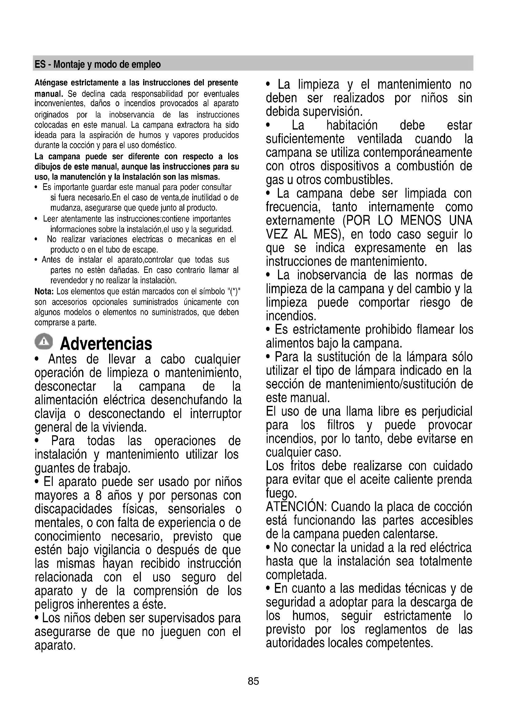 - Para la sustitución de la lámpara sólo utilizar el tipo de lámpara indicado en la sección de mantenimiento/sustitución de este manual. El uso de una llama libre es perjudicial para los filtros y puede provocar incendios, por lo tanto, debe evitarse en cualquier caso. Los fritos debe realizarse con cuidado para evitar que el aceite caliente prenda fuego. ATENCIÓN: Cuando la placa de cocción está funcionando las partes accesibles de la campana pueden calentarse.