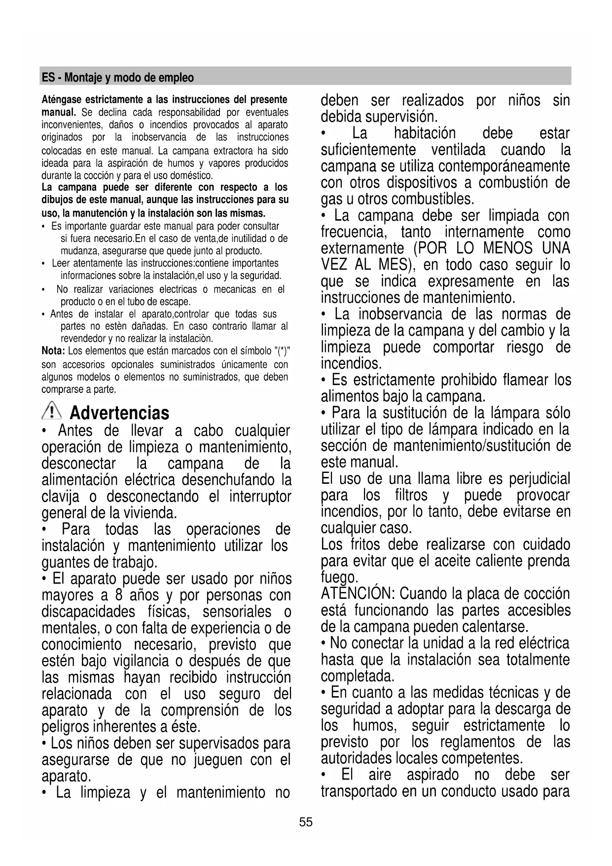 - La inobservancia de las normas de limpieza de la campana y del cambio y la limpieza puede comportar riesgo de incendios.
