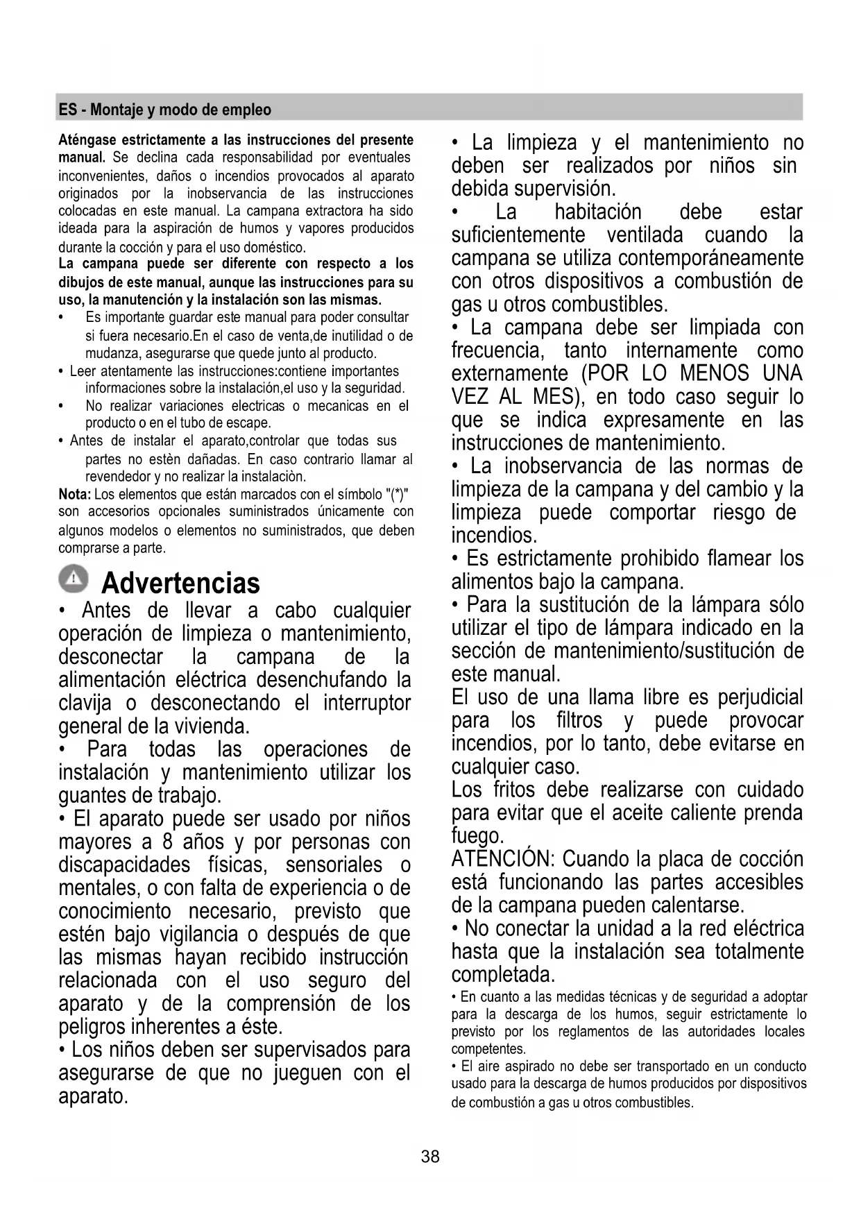- Antes de instalar el aparato,controlar que todas sus partes no estèn dañadas. En caso contrario llamar al revendedor y no realizar la instalaciòn. Nota: Los elementos que están marcados con el símbolo "(*)" son accesorios opcionales suministrados únicamente con algunos modelos o elementos no suministrados, que deben comprarse a parte. Advertencias