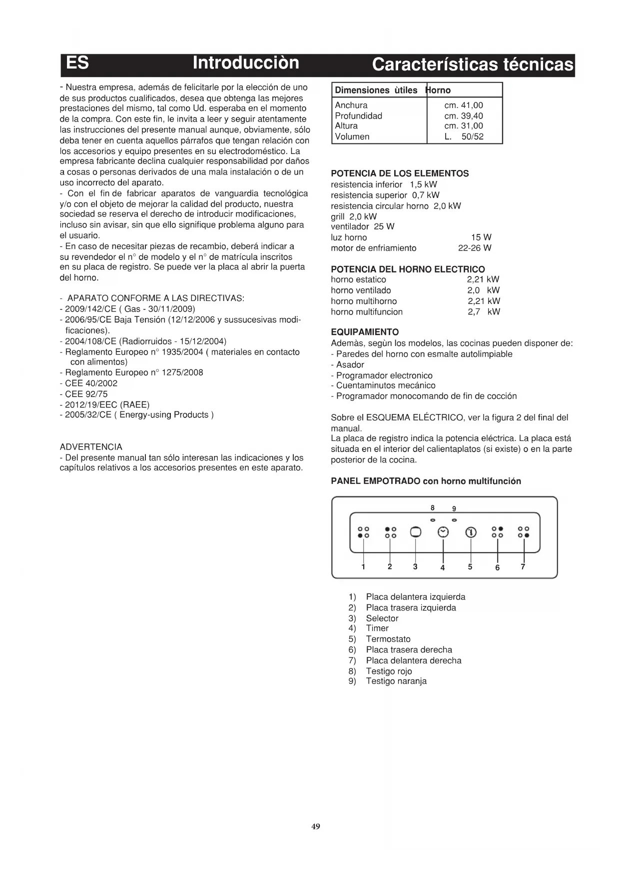 horno estatico 2,21 kW horno ventilado 2,0 kW horno multihorno 2,21 kW horno multifuncion 2,7 kW EQUIPAMIENTO Ademàs, segùn los modelos, las cocinas pueden disponer de: - Paredes del horno con esmalte autolimpiable - Asador - Programador electronico - Cuentaminutos mecánico - Programador monocomando de fin de cocción Sobre el ESQUEMA ELÉCTRICO, ver la figura 2 del final del manual. La placa de registro indica la potencia eléctrica. La placa está situada en el interior del calientaplatos (si existe) o en la parte posterior de la cocina. PANEL EMPOTRADO con horno multifunción