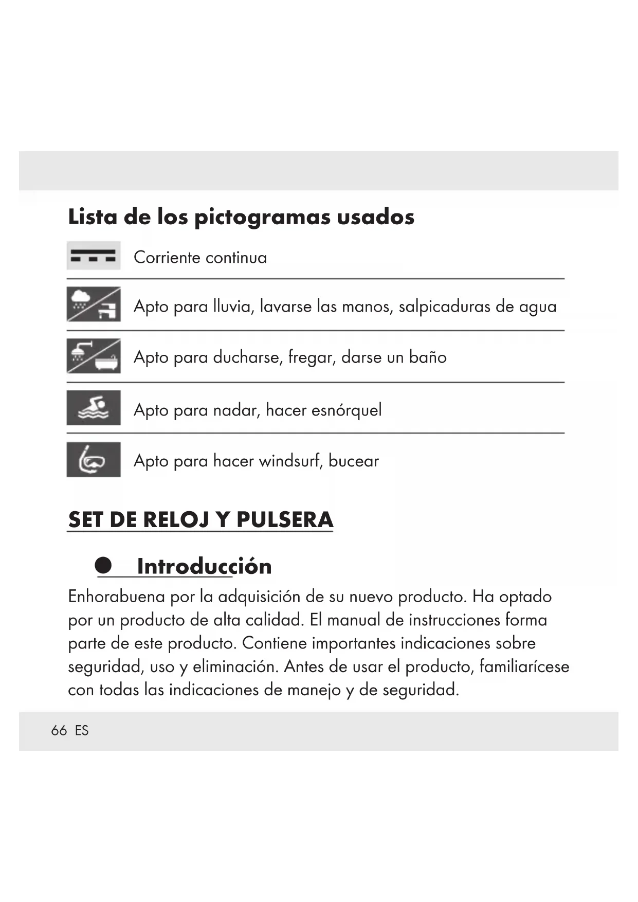 dentro (fig. F). Necesitará unos alicates o pinzas para extraer con cuidado la antigua barrita del deslizador (fig. G). Inserte la barrita de recambio con cuidado dentro del deslizador utilizando de nuevo los alicates o pinzas. La nueva barrita está instalada. Limpieza y mantenimiento Limpie el producto superficialmente con un paño humedecido, limpio y suave. En caso de necesidad, lave el producto con agua corriente. Después del lavado, séquelo por completo.73 ES Eliminación El embalaje está compuesto por materiales no contaminantes que pueden ser desechados en el centro de reciclaje local. El punto verde no se aplica en Alemania. Tenga en cuenta el distintivo del embalaje para la separación de residuos. Está compuesto por abreviaturas (a) y números (b) que significan lo siguiente: 1–7: plásticos / 20–22: papel y cartón / 80–98: materiales compuestos. El producto y el material de embalaje son reciclables. Separe los materiales para un mejor tratamiento de los residuos. El logotipo Triman se aplica solo para Francia. Para obtener información sobre las posibilidades de desecho del producto al final de su vida útil, acuda a la administración de su comunidad o ciudad.74 ES Para proteger el medio ambiente no tire el producto junto con la basura doméstica cuando ya no le sea útil. Deséchelo en un contenedor de reciclaje. Diríjase a la administración competente para obtener información sobre los puntos de recogida de residuos y sus horarios. Las pilas defectuosas o usadas deben ser recicladas según lo indicado en la directiva 2006/66/CE y en sus modificaciones. Devuelva las baterías y / o el producto en los puntos de recogida disponibles. Se pueden producir daños medioambientales como consecuencia de una eliminación incorrecta de las pilas. Las pilas usadas no deben desecharse en la basura doméstica. Pueden contener metales pesados venenosos y requieren de un tratamiento de basura especial. Los símbolos químicos de los metales pesados son los siguientes: Cd = cadmio, Hg = mercurio, Pb = plomo. Por ello, entregue las pilas usadas en un punto de recogida municipal.75 ES Garantía El producto ha sido fabricado cuidadosamente siguiendo exigentes normas de calidad y ha sido probado antes de su entrega. En caso de defecto del producto, usted tiene derechos legales frente al vendedor del mismo. Nuestra garantía (abajo indicada) no supone una restricción de dichos derechos legales. Este producto dispone de una garantía de 3 años desde la fecha de compra. El plazo de garantía comienza a partir de la fecha de compra. Por favor, conserve adecuadamente el justificante de compra original. Este documento se requerirá como prueba de que se realizó la compra. Si en el plazo de 3 años a partir de la fecha de compra se produce un fallo de material o fabricación en este producto, repararemos el producto o lo sustituiremos gratuitamente por un producto nuevo (según nuestra elección). La garantía quedará anulada si el producto resulta dañado o es utilizado o mantenido de forma inadecuada.76 ES La garantía cubre defectos de materiales o de fabricación. Esta garantía no cubre aquellos componentes del producto sometidos a un desgaste normal y que, por ello, puedan considerarse piezas de desgaste (por ej. las pilas). Tampoco cubre daños de componentes frágiles como, por ejemplo, los interruptores, baterías y piezas de cristal. Además, la garantía tampoco cubre la pérdida de impermeabilidad. La resistencia al agua no es una propiedad duradera, por lo que debe revisarse regularmente. Tenga en cuenta que si permite la apertura y reparación del reloj por personas no autorizadas, perderá los derechos de garantía.77 PT Lista dos pictogramas utilizados ..............Pagina 78 Introdução ...................................Pagina 78 Utilização adequada..........................Pagina 79 Descrição das peças ..........................Pagina 79 Dados técnicos ...............................Pagina 80 Volume de entrega ...........................Pagina 80 Preparar o produto para utilização ...........Pagina 81 Substituir a bateria............................Pagina 81 Ajustar a hora ................................Pagina 81 Resistência à água............................Pagina 82 Encurtar a bracelete do relógio ...............Pagina 82 Modelo Nº. HG03031A / HG03031C ..........Pagina 82 Modelo Nº. HG03031E .......................Pagina 82 Retirar segmentos (fig. D).......................Pagina 83 Como substituir o pino dentro do cursor deslizante (fig. E, F, G) ......................Pagina 84 Limpeza e conservação .......................Pagina 84 Eliminação ...................................Pagina 85 Garantia .....................................Pagina 8778 PT Lista dos pictogramas utilizados Corrente contínua Adequado para utilizar à chuva, ao lavar as mãos e resistente a salpicos de água Adequado para utilizar no duche, ao lavar a loiça e a tomar banho Adequado para utilizar na piscina e no snorkeling Adequado para utilizar no windsurf e no mergulho CONJUNTO DE RELÓGIOS DE PULSO E BIJUTARIA Introdução Damos-lhe os parabéns pela aquisição do seu novo produto. Acabou de adquirir um produto de grande qualidade. O manual de instruções é parte integrante deste produto.79 PT Contém indicações importantes referentes à segurança, utilização e eliminação. Familiarize-se com todas as indicações de utilização e de segurança do produto. Utilize o produto apenas como descrito e para as áreas de aplicação indicadas. Se transmitir o artigo a terceiros, entregue também os respectivos documentos. Utilização adequada O produto destina-se apenas para uso doméstico privado e não se destina a utilização comercial. Descrição das peças